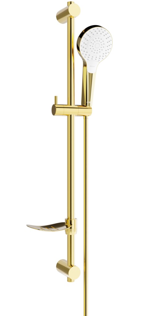 Technická data: Materiál hřídele: nerezová ocel, ABS Povrchová úprava tyčí: zlatá Výška: 800 mm Šířka lišty: 22 mm Vzdálenost od stěny: 105 mm Miska na mýdlo Posuvný držák sluchátka Nastavitelné montážní držáky Materiál sluchátek: plast Povrchová úprava sluchátek: zlatá / bílá Počet funkcí: 3 Materiál hadice: PVC Hadová úprava: zlato Délka hadice: 150 cm Mosazné hroty Hladký povrch usnadňuje udržování čistoty Otočné hroty zabraňují kroucení Pružný materiál odolný proti roztažení a ohnutí