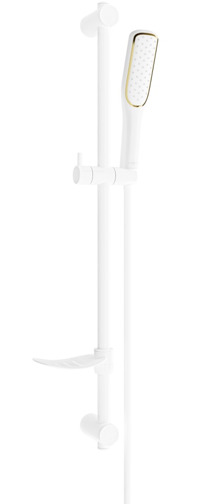 Technická data: Materiál hřídele: nerezová ocel, ABS Povrchová úprava tyčinky: bílá Výška: 800 mm Šířka lišty: 22 mm Vzdálenost od stěny: 105 mm Miska na mýdlo Posuvný držák sluchátka Nastavitelné montážní držáky Materiál sluchátek: plast Povrchová úprava sluchátek: bílá / zlatá Počet funkcí: 3 Materiál hadice: PVC Provedení hadice: bílá Délka hadice: 150 cm Mosazné hroty Hladký povrch usnadňuje udržování čistoty Otočné hroty zabraňují kroucení Pružný materiál odolný proti roztažení a ohnutí