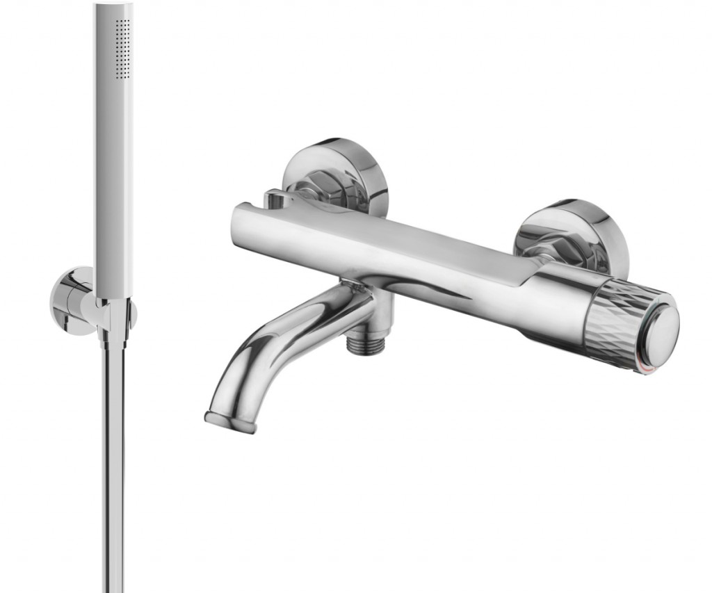 Technická data: Materiál vanové baterie: mosaz Povrchová úprava: Chrome Hlava: Keramická Perlátor: Ano Ovládání teploty vody pomocí knoflíku Zapínání a vypínání vodního proudu pomocí tlačítka ON-OFF Materiál sluchátek: mosaz Povrchová úprava sluchátek: Chrome Počet funkcí: 1 Připojení: G 1/2" Výška sluchátek: 182 mm Šířka hlavy: 25 mm Materiál rukojeti: mosaz Povrchová úprava rukojeti: Chrom Typ montáže: Montáž na stěnu Rozměry rozety: ø50 mm Vzdálenost od stěny: 55 mm Materiál hadice: PVC Povrchová úprava hadice: Chrom Délka hadice: 150 cm Připojení: 1/2" Mosazné hroty Hladký povrch usnadňuje údržbu Otočné hroty zabraňují kroucení Pružný materiál odolný proti roztahování a ohýbání