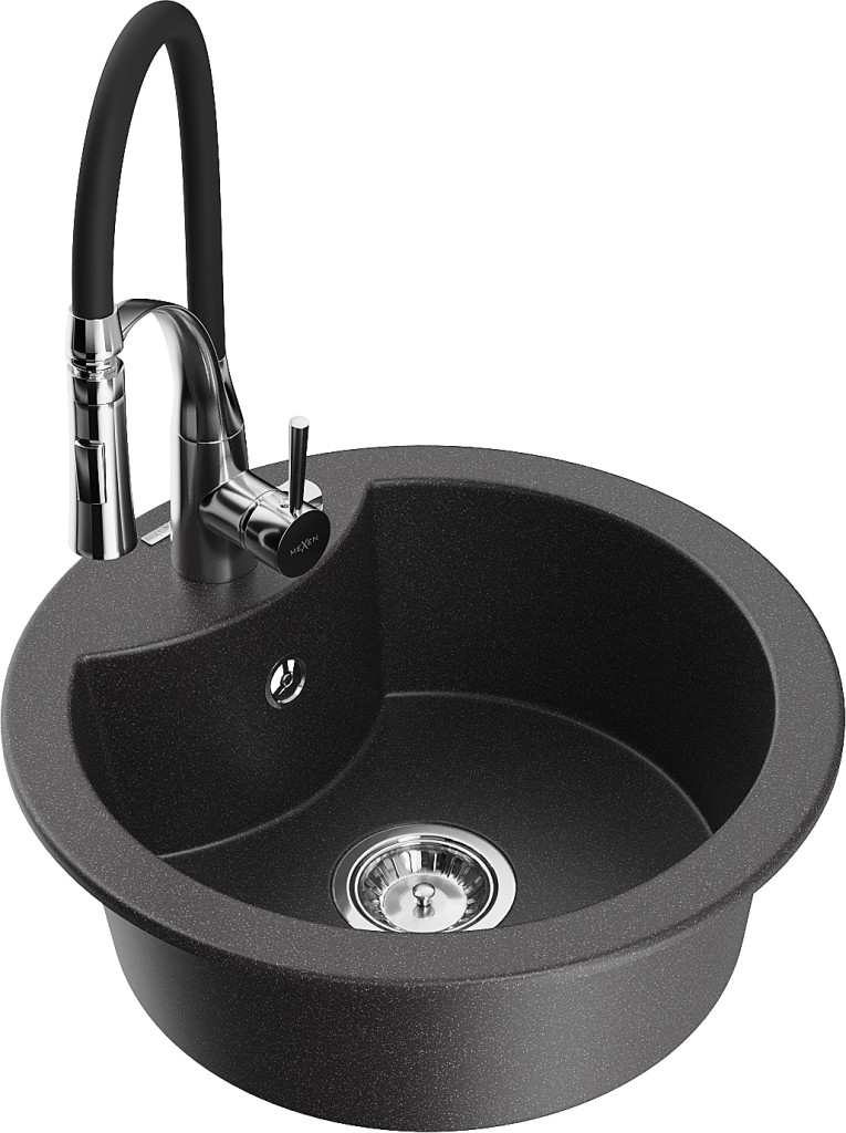 Technická data: dřez: Rozměry: 488 x 488 x 167 mm Hloubka komory: 157 mm Šířka komory: 406 mm Průměr odtoku: ø90 mm Typ: 1-komorový Typ: Zapuštěné do pracovní desky Barva: Skvrnitá černá Povrchová úprava sifonu: Chrome Materiál: žula (80 % žulové kamenivo, 20 % pryskyřice) Přepadový otvor: Ano Otvory: (baterie, automatické) 2 Vysoká odolnost proti poškrábání a změně barvy Odolnost proti tepelným šokům Snadno čistitelný povrch Jeden dodatečný vyfrézovaný otvor pro samoděrování ø35 kuchyňská baterie: Materiál: mosaz Barva: chrom/černá Hlava: Keramická Provzdušňovač: Ano Typ: Jedna páka Výška baterie: 430 mm Rozsah výtoku: 185 mm Baterie má výsuvný výtok