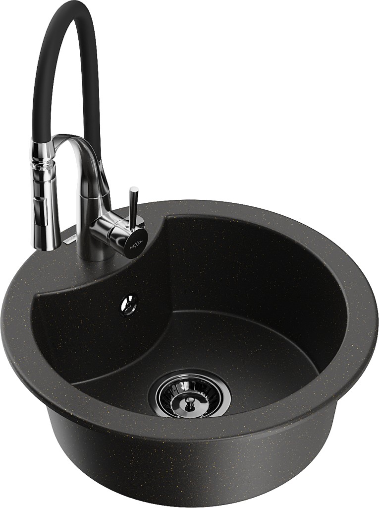 Technická data: dřez: Rozměry: 488 x 488 x 167 mm Hloubka komory: 157 mm Šířka komory: 406 mm Průměr odtoku: ø90 mm Typ: 1-komorový Typ: Zapuštěné do pracovní desky Barva: černá/zlatá metalíza Povrchová úprava sifonu: černá Materiál: žula (80 % žulové kamenivo, 20 % pryskyřice) Přepadový otvor: Ano Otvory: (baterie, automatické) 2 Vysoká odolnost proti poškrábání a změně barvy Odolnost proti tepelným šokům Snadno čistitelný povrch Jeden dodatečný vyfrézovaný otvor pro samoděrování ø35 kuchyňská baterie: Materiál: mosaz Barva: chrom/černá Hlava: Keramická Provzdušňovač: Ano Typ: Jedna páka Výška baterie: 430 mm Rozsah výtoku: 185 mm Baterie má výsuvný výtok