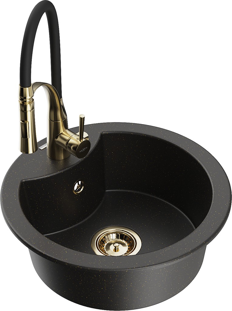 Technická data: dřez: Rozměry: 488 x 488 x 167 mm Hloubka komory: 157 mm Šířka komory: 406 mm Průměr odtoku: ø90 mm Typ: 1-komorový Typ: Zapuštěné do pracovní desky Barva: černá/zlatá metalíza Povrchová úprava sifonu: zlatá Materiál: žula (80 % žulové kamenivo, 20 % pryskyřice) Přepadový otvor: Ano Otvory: (baterie, automatické) 2 Vysoká odolnost proti poškrábání a změně barvy Odolnost proti tepelným šokům Snadno čistitelný povrch Jeden dodatečný vyfrézovaný otvor pro samoděrování ø35 kuchyňská baterie: Materiál: mosaz Barva: Zlatá/Černá Hlava: Keramická Provzdušňovač: Ano Typ: Jedna páka Výška baterie: 430 mm Rozsah výtoku: 185 mm Baterie má výsuvný výtok