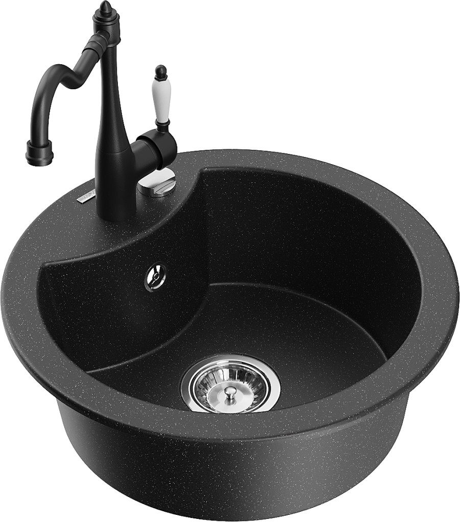 Technická data: dřez: Rozměry: 488 x 488 x 167 mm Hloubka komory: 157 mm Šířka komory: 406 mm Průměr odtoku: ø90 mm Typ: 1-komorový Typ: Zapuštěné do pracovní desky Barva: černá/stříbrná metalíza Povrchová úprava sifonu: Chrome Materiál: žula (80 % žulové kamenivo, 20 % pryskyřice) Přepadový otvor: Ano Otvory: (baterie, automatické) 2 Vysoká odolnost proti poškrábání a změně barvy Odolnost proti tepelným šokům Snadno čistitelný povrch Jeden dodatečný vyfrézovaný otvor pro samoděrování ø35 kuchyňská baterie: Materiál: mosaz Černá barva Hlava: Keramická Provzdušňovač: Ano Typ: Jedna páka Výška baterie: 290 mm Rozsah výtoku: 260 mm