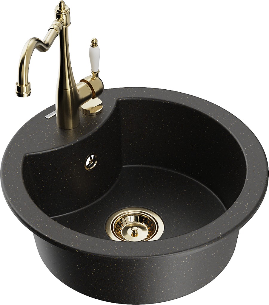 Technická data: dřez: Rozměry: 488 x 488 x 167 mm Hloubka komory: 157 mm Šířka komory: 406 mm Průměr odtoku: ø90 mm Typ: 1-komorový Typ: Zapuštěné do pracovní desky Barva: černá/zlatá metalíza Povrchová úprava sifonu: zlatá Materiál: žula (80 % žulové kamenivo, 20 % pryskyřice) Přepadový otvor: Ano Otvory: (baterie, automatické) 2 Vysoká odolnost proti poškrábání a změně barvy Odolnost proti tepelným šokům Snadno čistitelný povrch Jeden dodatečný vyfrézovaný otvor pro samoděrování ø35 kuchyňská baterie: Materiál: mosaz Barva: Zlatá Hlava: Keramická Provzdušňovač: Ano Typ: Jedna páka Výška baterie: 290 mm Rozsah výtoku: 260 mm