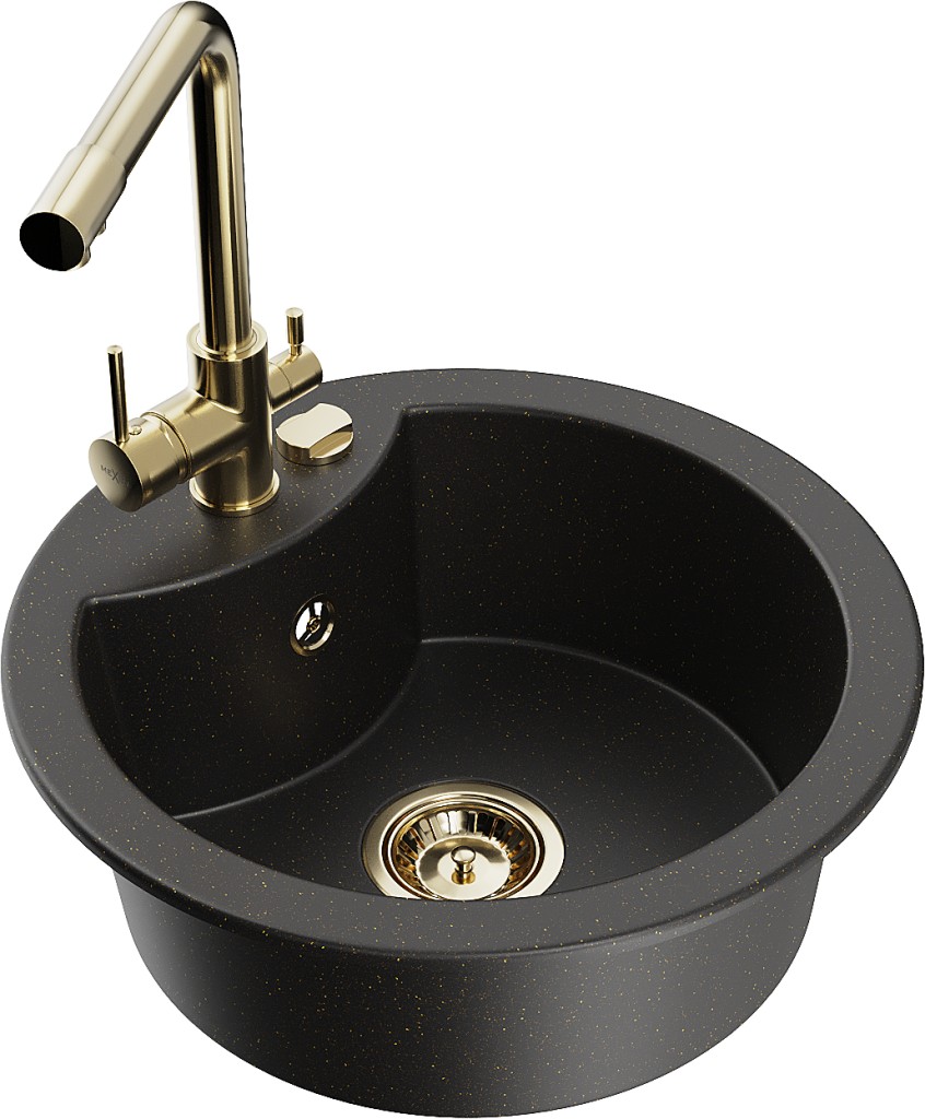 Technická data: dřez: Rozměry: 488 x 488 x 167 mm Hloubka komory: 157 mm Šířka komory: 406 mm Průměr odtoku: ø90 mm Typ: 1-komorový Typ: Zapuštěné do pracovní desky Barva: černá/zlatá metalíza Povrchová úprava sifonu: zlatá Materiál: žula (80 % žulové kamenivo, 20 % pryskyřice) Přepadový otvor: Ano Otvory: (baterie, automatické) 2 Vysoká odolnost proti poškrábání a změně barvy Odolnost proti tepelným šokům Snadno čistitelný povrch Jeden dodatečný vyfrézovaný otvor pro samoděrování ø35 kuchyňská baterie: Materiál: mosaz Barva: Zlatá Hlava: Keramická Provzdušňovač: Ano Typ: Dvě rukojeti Rozsah výtoku: 235 mm Výška baterie: 315 mm Dvouhlavá baterie s přídavným kanálem pro filtrovanou pitnou vodu