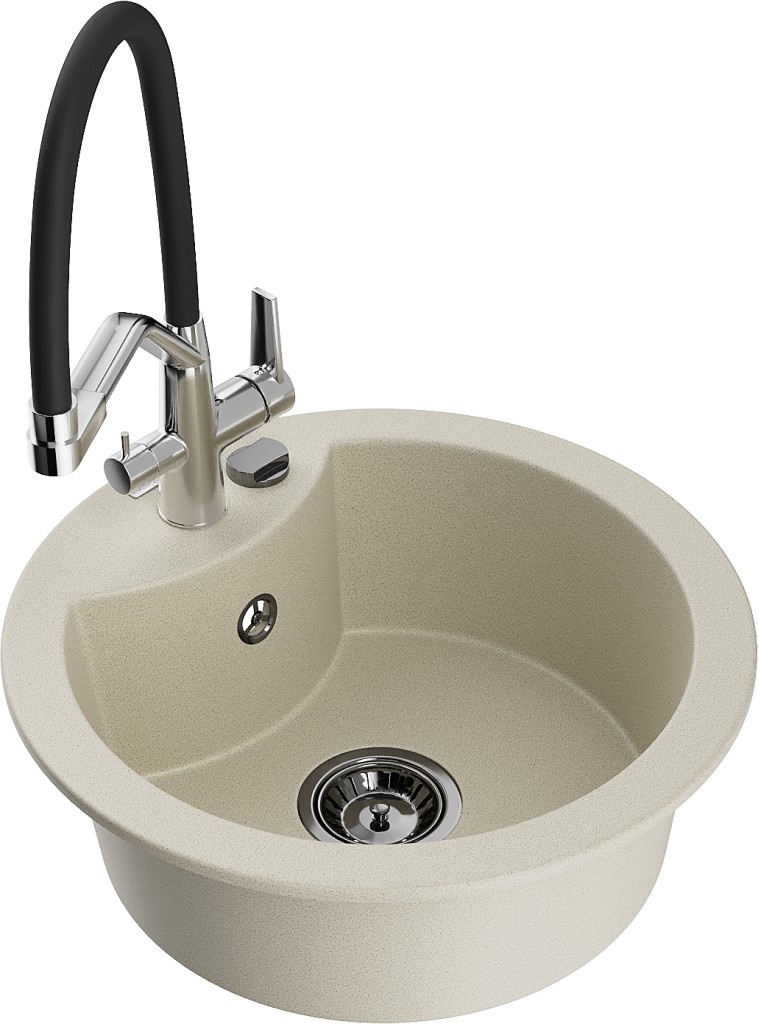 Technická data: Dřez: Rozměr: 488x488x167 mm Hloubka komory: 157 mm Šířka komory: 406 mm Průměr odtoku: ø90 mm Typ: 1-komorový Typ: Zapuštěné do pracovní desky Barva béžová Povrchová úprava sifonu: černá Materiál: žula (80% žulové kamenivo 20% pryskyřice) Přepadový otvor: Ano Otvory: (baterie, automat) 2 Vysoká odolnost proti poškrábání a změně barvy Odolnost proti tepelným šokům Povrch pro snadné čištění Jeden dodatečný vyfrézovaný otvor pro samoděrování ø35 Kuchyňská baterie: Materiál: mosaz Barva: chrom/černá Hlavy: Keramické Perlátor: Ano Typ výtoku: Flexibilní s mosazným držákem Rozsah výtoku: 260 mm Výška: 405 mm Typ: Dvě rukojeti Dvouhlavá baterie s přídavným filtrem na pitnou vodu