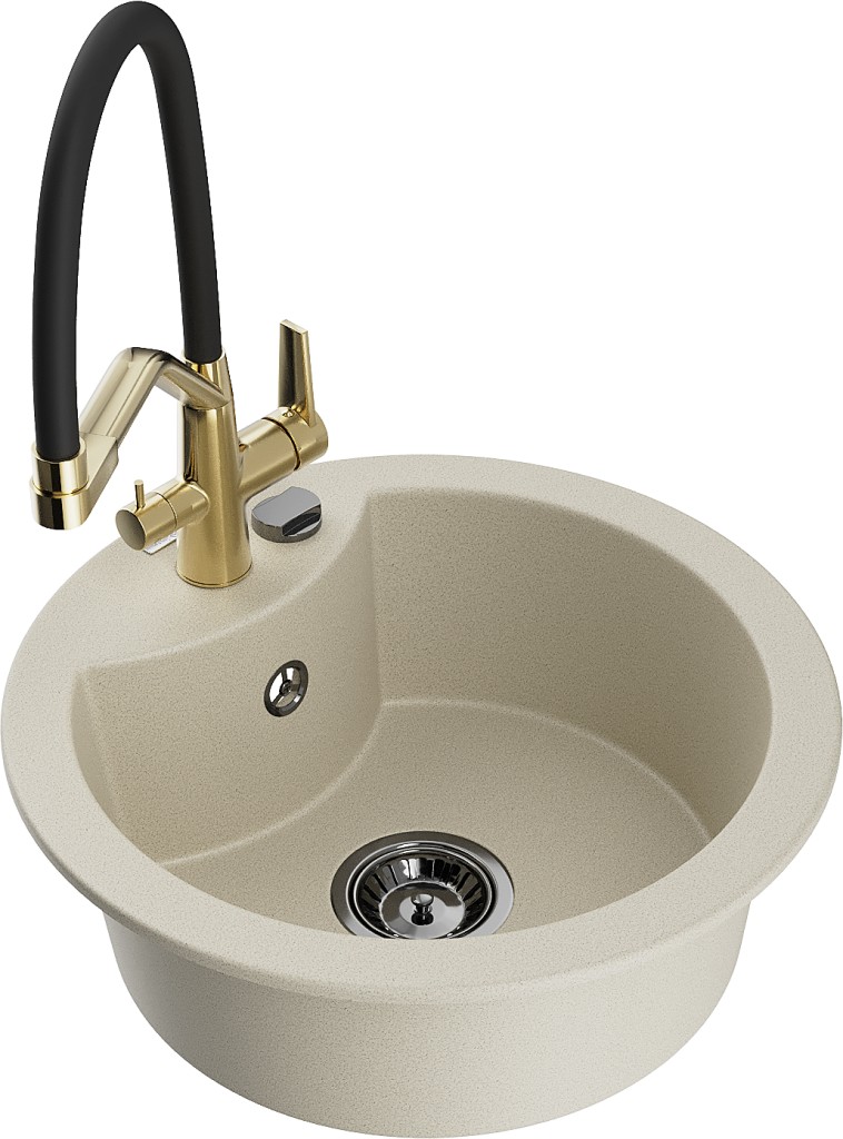 Technická data: Dřez: Rozměr: 488x488x167 mm Hloubka komory: 157 mm Šířka komory: 406 mm Průměr odtoku: ø90 mm Typ: 1-komorový Typ: Zapuštěné do pracovní desky Barva béžová Povrchová úprava sifonu: černá Materiál: žula (80% žulové kamenivo 20% pryskyřice) Přepadový otvor: Ano Otvory: (baterie, automat) 2 Vysoká odolnost proti poškrábání a změně barvy Odolnost proti tepelným šokům Povrch pro snadné čištění Jeden dodatečný vyfrézovaný otvor pro samoděrování ø35 Kuchyňská baterie: Materiál: mosaz Barva: Zlatá/Černá Hlavy: Keramické Perlátor: Ano Typ výtoku: Flexibilní s mosazným držákem Rozsah výtoku: 260 mm Výška: 405 mm Typ: Dvě rukojeti Dvouhlavá baterie s přídavným filtrem na pitnou vodu