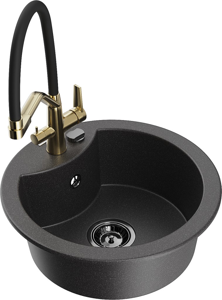 Technická data: dřez: Rozměry: 488 x 488 x 167 mm Hloubka komory: 157 mm Šířka komory: 406 mm Průměr odtoku: ø90 mm Typ: 1-komorový Typ: Zapuštěné do pracovní desky Barva: Skvrnitá černá Povrchová úprava sifonu: černá Materiál: žula (80 % žulové kamenivo, 20 % pryskyřice) Přepadový otvor: Ano Otvory: (baterie, automatické) 2 Vysoká odolnost proti poškrábání a změně barvy Odolnost proti tepelným šokům Snadno čistitelný povrch Jeden dodatečný vyfrézovaný otvor pro samoděrování ø35 kuchyňská baterie: Materiál: mosaz Barva: Zlatá/Černá Hlavy: Keramické Provzdušňovač: Ano Typ hubice: Flexibilní s mosazným držákem Rozsah výtoku: 260 mm Výška: 405 mm Typ: Dvě rukojeti Dvouhlavá baterie s přídavným filtrem na pitnou vodu