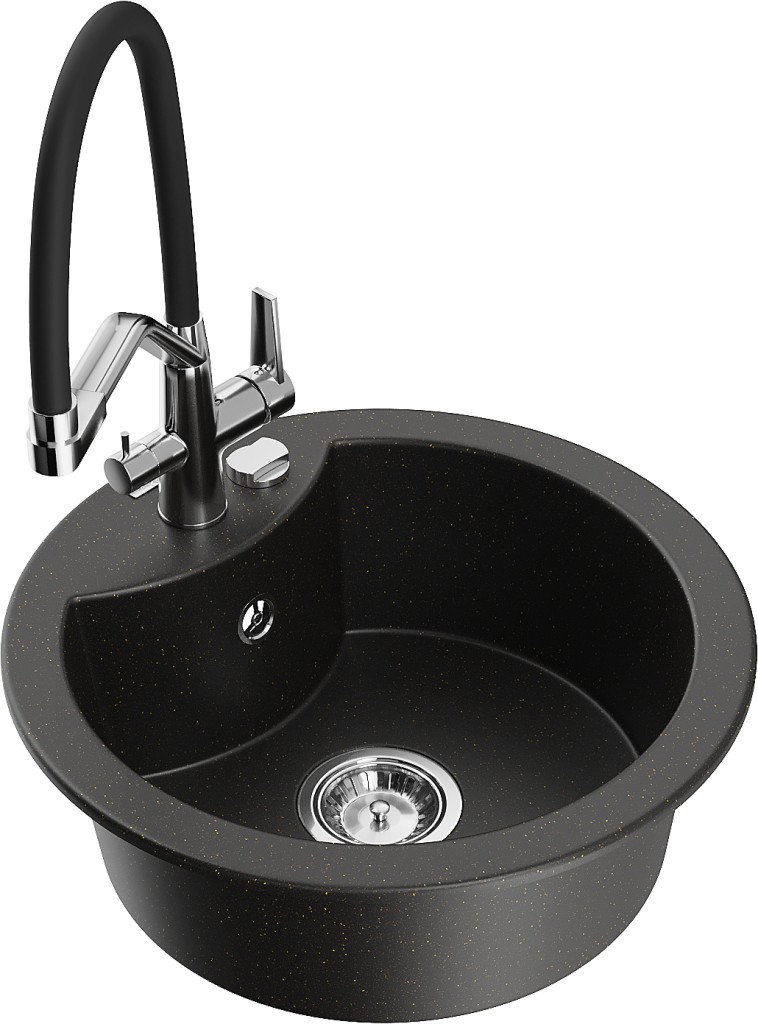 Technická data: dřez: Rozměry: 488 x 488 x 167 mm Hloubka komory: 157 mm Šířka komory: 406 mm Průměr odtoku: ø90 mm Typ: 1-komorový Typ: Zapuštěné do pracovní desky Barva: černá/zlatá metalíza Povrchová úprava sifonu: Chrome Materiál: žula (80 % žulové kamenivo, 20 % pryskyřice) Přepadový otvor: Ano Otvory: (baterie, automatické) 2 Vysoká odolnost proti poškrábání a změně barvy Odolnost proti tepelným šokům Snadno čistitelný povrch Jeden dodatečný vyfrézovaný otvor pro samoděrování ø35 kuchyňská baterie: Materiál: mosaz Barva: chrom/černá Hlavy: Keramické Provzdušňovač: Ano Typ hubice: Flexibilní s mosazným držákem Rozsah výtoku: 260 mm Výška: 405 mm Typ: Dvě rukojeti Dvouhlavá baterie s přídavným filtrem na pitnou vodu