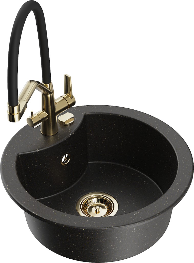 Technická data: dřez: Rozměry: 488 x 488 x 167 mm Hloubka komory: 157 mm Šířka komory: 406 mm Průměr odtoku: ø90 mm Typ: 1-komorový Typ: Zapuštěné do pracovní desky Barva: černá/zlatá metalíza Povrchová úprava sifonu: zlatá Materiál: žula (80 % žulové kamenivo, 20 % pryskyřice) Přepadový otvor: Ano Otvory: (baterie, automatické) 2 Vysoká odolnost proti poškrábání a změně barvy Odolnost proti tepelným šokům Snadno čistitelný povrch Jeden dodatečný vyfrézovaný otvor pro samoděrování ø35 kuchyňská baterie: Materiál: mosaz Barva: Zlatá/Černá Hlavy: Keramické Provzdušňovač: Ano Typ hubice: Flexibilní s mosazným držákem Rozsah výtoku: 260 mm Výška: 405 mm Typ: Dvě rukojeti Dvouhlavá baterie s přídavným filtrem na pitnou vodu