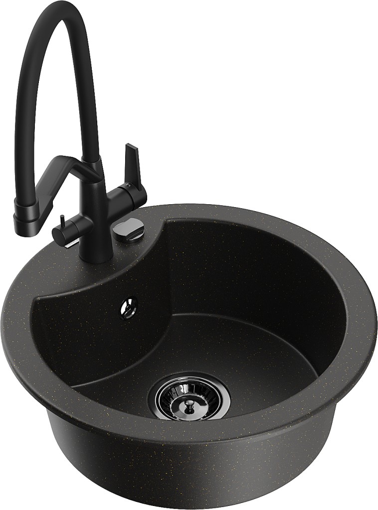 Technická data: dřez: Rozměry: 488 x 488 x 167 mm Hloubka komory: 157 mm Šířka komory: 406 mm Průměr odtoku: ø90 mm Typ: 1-komorový Typ: Zapuštěné do pracovní desky Barva: černá/zlatá metalíza Povrchová úprava sifonu: černá Materiál: žula (80 % žulové kamenivo, 20 % pryskyřice) Přepadový otvor: Ano Otvory: (baterie, automatické) 2 Vysoká odolnost proti poškrábání a změně barvy Odolnost proti tepelným šokům Snadno čistitelný povrch Jeden dodatečný vyfrézovaný otvor pro samoděrování ø35 kuchyňská baterie: Materiál: mosaz Černá barva Hlavy: Keramické Provzdušňovač: Ano Typ hubice: Flexibilní s mosazným držákem Rozsah výtoku: 260 mm Výška: 405 mm Typ: Dvě rukojeti Dvouhlavá baterie s přídavným filtrem na pitnou vodu