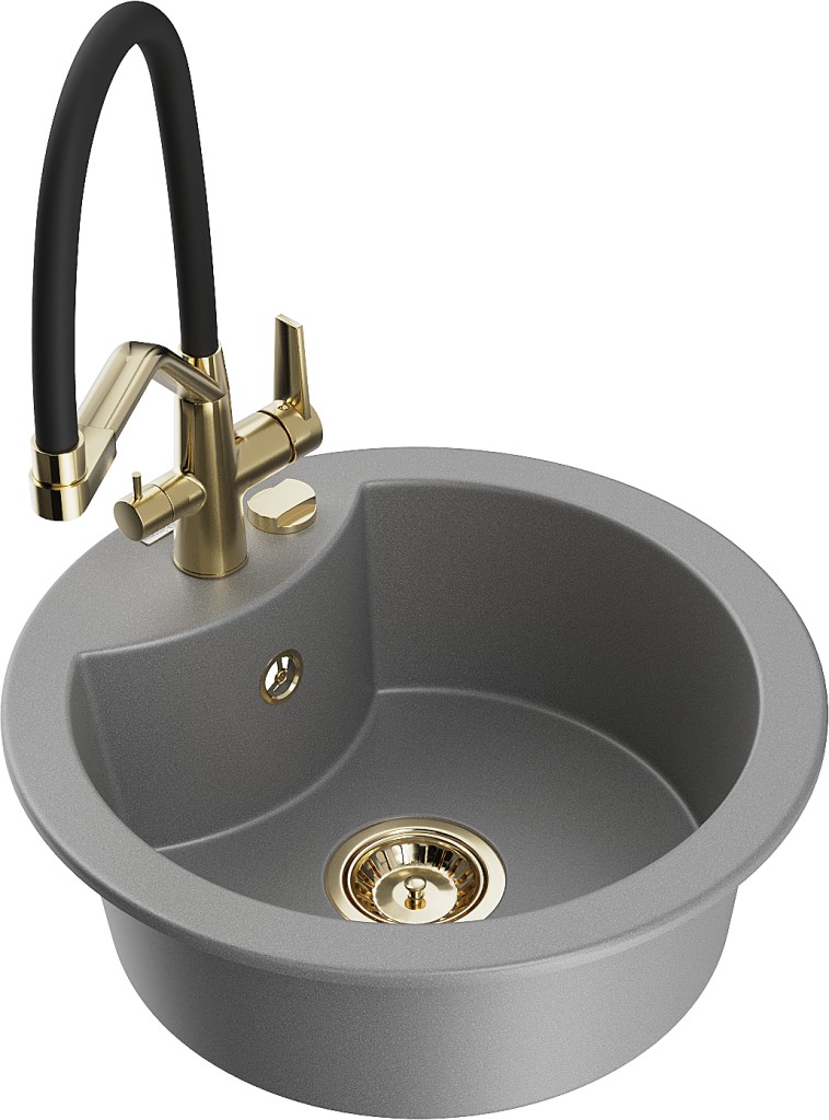 Technická data: dřez: Rozměry: 488 x 488 x 167 mm Hloubka komory: 157 mm Šířka komory: 406 mm Průměr odtoku: ø90 mm Typ: 1-komorový Typ: Zapuštěné do pracovní desky Šedá barva Povrchová úprava sifonu: zlatá Materiál: žula (80 % žulové kamenivo, 20 % pryskyřice) Přepadový otvor: Ano Otvory: (baterie, automatické) 2 Vysoká odolnost proti poškrábání a změně barvy Odolnost proti tepelným šokům Snadno čistitelný povrch Jeden dodatečný vyfrézovaný otvor pro samoděrování ø35 kuchyňská baterie: Materiál: mosaz Barva: Zlatá/Černá Hlavy: Keramické Provzdušňovač: Ano Typ hubice: Flexibilní s mosazným držákem Rozsah výtoku: 260 mm Výška: 405 mm Typ: Dvě rukojeti Dvouhlavá baterie s přídavným filtrem na pitnou vodu