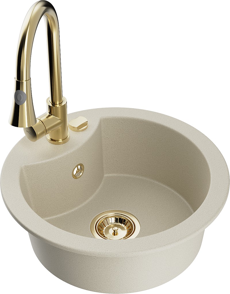 Technická data: Dřez: Rozměr: 488x488x167 mm Hloubka komory: 157 mm Šířka komory: 406 mm Průměr odtoku: ø90 mm Typ: 1-komorový Typ: Zapuštěné do pracovní desky Barva béžová Povrchová úprava sifonu: zlatá Materiál: žula (80% žulové kamenivo 20% pryskyřice) Přepadový otvor: Ano Otvory: (baterie, automat) 2 Vysoká odolnost proti poškrábání a změně barvy Odolnost proti tepelným šokům Povrch pro snadné čištění Jeden dodatečný vyfrézovaný otvor pro samoděrování ø35 Kuchyňská baterie: Materiál: mosaz Barva: Zlatá Hlava: Keramická Perlátor: Ano Typ: Jednopákové Výška baterie: 380 mm Rozsah výtoku: 252 mm Typ výtoku: Výsuvný