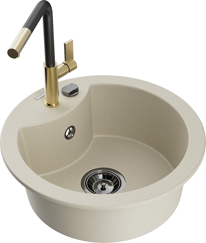 Technická data: Dřez: Rozměr: 488x488x167 mm Hloubka komory: 157 mm Šířka komory: 406 mm Průměr odtoku: ø90 mm Typ: 1-komorový Typ: Zapuštěné do pracovní desky Barva béžová Povrchová úprava sifonu: černá Materiál: žula (80% žulové kamenivo 20% pryskyřice) Přepadový otvor: Ano Otvory: (baterie, automat) 2 Vysoká odolnost proti poškrábání a změně barvy Odolnost proti tepelným šokům Povrch pro snadné čištění Jeden dodatečný vyfrézovaný otvor pro samoděrování ø35 Kuchyňská baterie: Materiál: mosaz Barva: Zlatá/Černá Hlava: Keramická Perlátor: Ano Typ: Jednopákové Rozsah výtoku: 245 mm Výška baterie: 307 mm