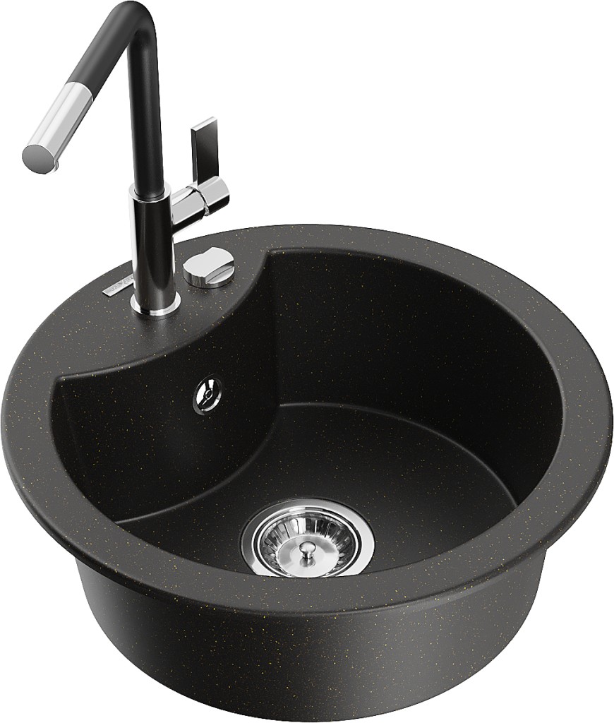 Technická data: dřez: Rozměry: 488 x 488 x 167 mm Hloubka komory: 157 mm Šířka komory: 406 mm Průměr odtoku: ø90 mm Typ: 1-komorový Typ: Zapuštěné do pracovní desky Barva: černá/zlatá metalíza Povrchová úprava sifonu: Chrome Materiál: žula (80 % žulové kamenivo, 20 % pryskyřice) Přepadový otvor: Ano Otvory: (baterie, automatické) 2 Vysoká odolnost proti poškrábání a změně barvy Odolnost proti tepelným šokům Snadno čistitelný povrch Jeden dodatečný vyfrézovaný otvor pro samoděrování ø35 kuchyňská baterie: Materiál: mosaz Barva: chrom/černá Hlava: Keramická Provzdušňovač: Ano Typ: Jedna páka Rozsah výtoku: 245 mm Výška baterie: 307 mm