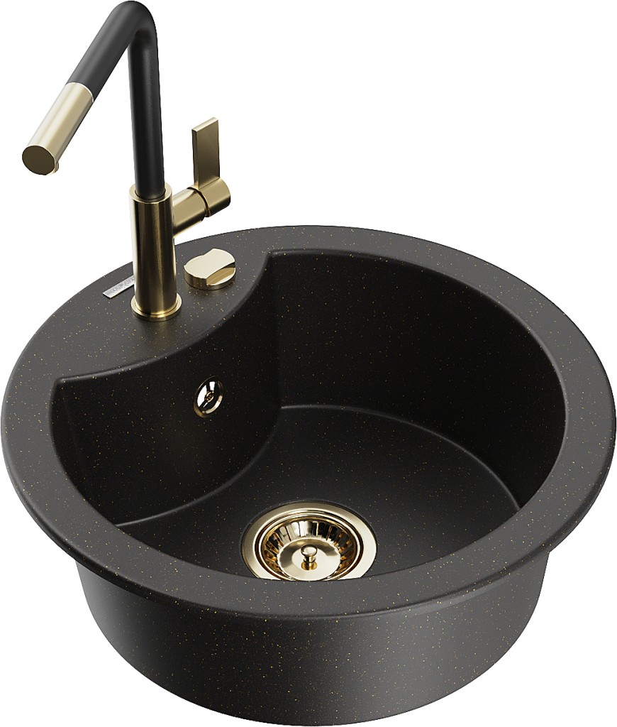 Technická data: dřez: Rozměry: 488 x 488 x 167 mm Hloubka komory: 157 mm Šířka komory: 406 mm Průměr odtoku: ø90 mm Typ: 1-komorový Typ: Zapuštěné do pracovní desky Barva: černá/zlatá metalíza Povrchová úprava sifonu: zlatá Materiál: žula (80 % žulové kamenivo, 20 % pryskyřice) Přepadový otvor: Ano Otvory: (baterie, automatické) 2 Vysoká odolnost proti poškrábání a změně barvy Odolnost proti tepelným šokům Snadno čistitelný povrch Jeden dodatečný vyfrézovaný otvor pro samoděrování ø35 kuchyňská baterie: Materiál: mosaz Barva: Zlatá/Černá Hlava: Keramická Provzdušňovač: Ano Typ: Jedna páka Rozsah výtoku: 245 mm Výška baterie: 307 mm