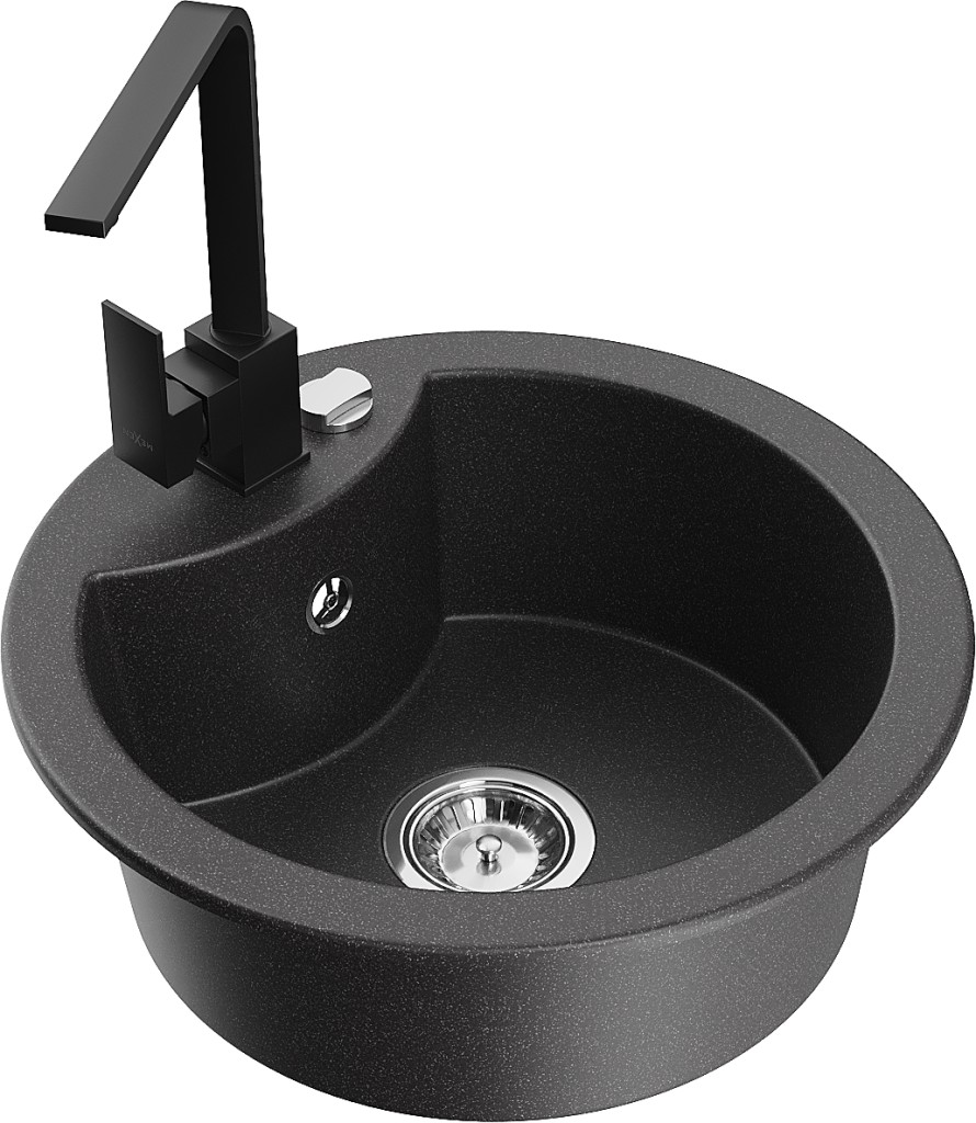 Technická data: dřez: Rozměry: 488 x 488 x 167 mm Hloubka komory: 157 mm Šířka komory: 406 mm Průměr odtoku: ø90 mm Typ: 1-komorový Typ: Zapuštěné do pracovní desky Barva: Skvrnitá černá Povrchová úprava sifonu: Chrome Materiál: žula (80 % žulové kamenivo, 20 % pryskyřice) Přepadový otvor: Ano Otvory: (baterie, automatické) 2 Vysoká odolnost proti poškrábání a změně barvy Odolnost proti tepelným šokům Snadno čistitelný povrch Jeden dodatečný vyfrézovaný otvor pro samoděrování ø35 kuchyňská baterie: Materiál: mosaz Černá barva Hlava: Keramická Provzdušňovač: Ano Typ: Jedna páka Výška baterie: 290 mm Rozsah výtoku: 220 mm