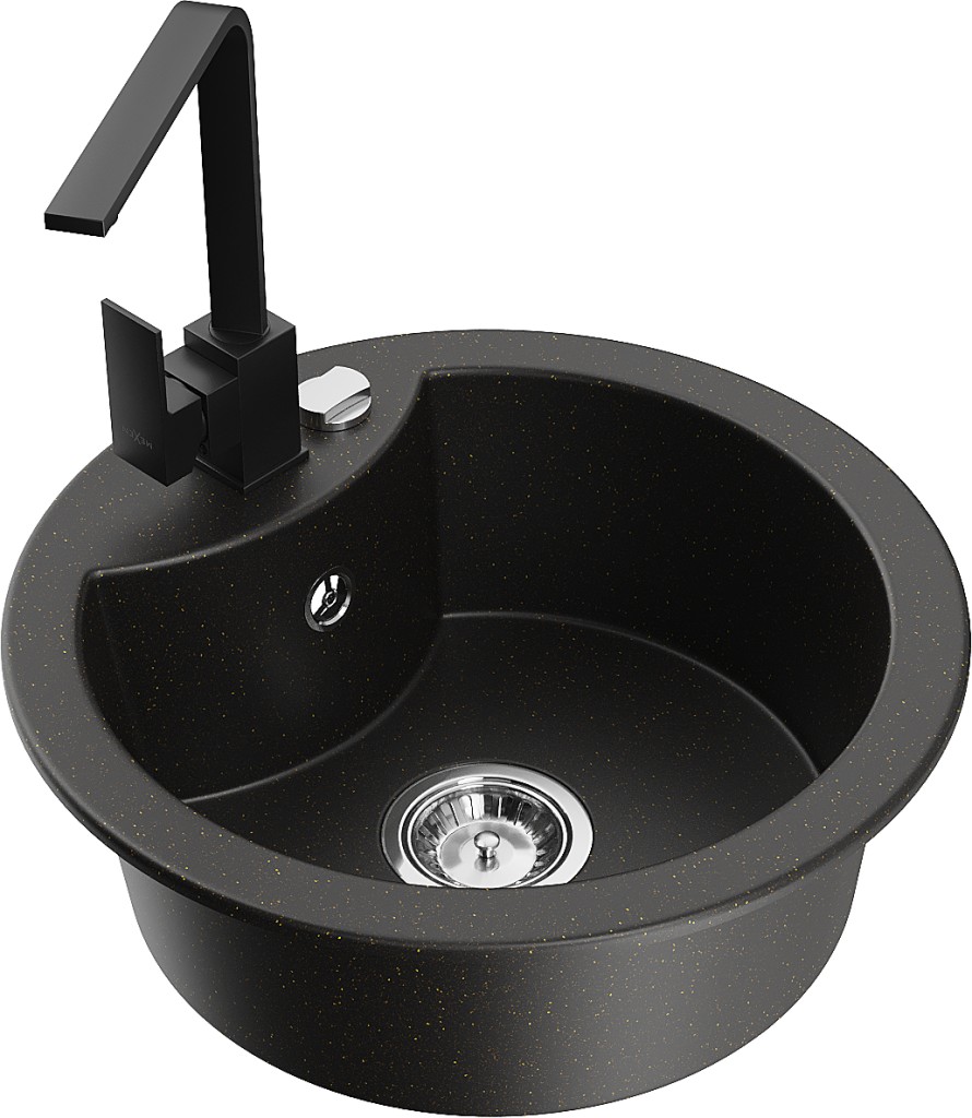 Technická data: dřez: Rozměry: 488 x 488 x 167 mm Hloubka komory: 157 mm Šířka komory: 406 mm Průměr odtoku: ø90 mm Typ: 1-komorový Typ: Zapuštěné do pracovní desky Barva: černá/zlatá metalíza Povrchová úprava sifonu: Chrome Materiál: žula (80 % žulové kamenivo, 20 % pryskyřice) Přepadový otvor: Ano Otvory: (baterie, automatické) 2 Vysoká odolnost proti poškrábání a změně barvy Odolnost proti tepelným šokům Snadno čistitelný povrch Jeden dodatečný vyfrézovaný otvor pro samoděrování ø35 kuchyňská baterie: Materiál: mosaz Černá barva Hlava: Keramická Provzdušňovač: Ano Typ: Jedna páka Výška baterie: 290 mm Rozsah výtoku: 220 mm