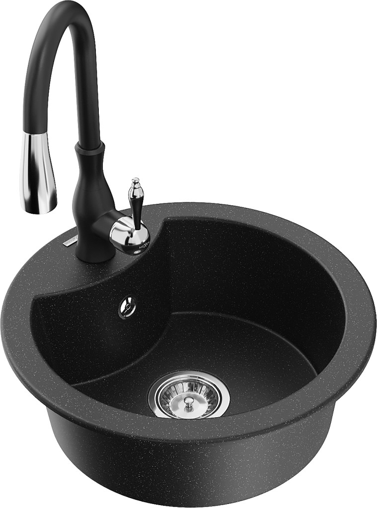 Technická data: dřez: Rozměry: 488 x 488 x 167 mm Hloubka komory: 157 mm Šířka komory: 406 mm Průměr odtoku: ø90 mm Typ: 1-komorový Typ: Zapuštěné do pracovní desky Barva: černá/stříbrná metalíza Povrchová úprava sifonu: Chrome Materiál: žula (80 % žulové kamenivo, 20 % pryskyřice) Přepadový otvor: Ano Otvory: (baterie, automatické) 2 Vysoká odolnost proti poškrábání a změně barvy Odolnost proti tepelným šokům Snadno čistitelný povrch Jeden dodatečný vyfrézovaný otvor pro samoděrování ø35 kuchyňská baterie: Materiál: mosaz Černá barva Hlava: Keramická Provzdušňovač: Ano Typ: Jedna páka Výška baterie: 410 mm Rozsah výtoku: 231 mm