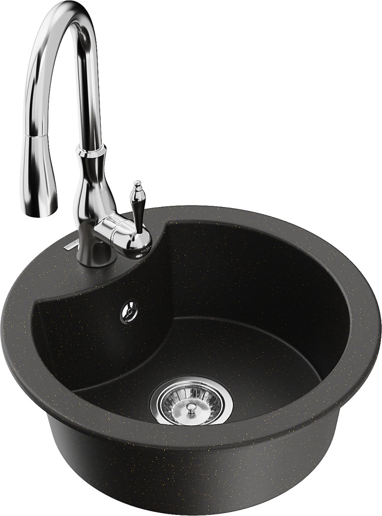Technická data: dřez: Rozměry: 488 x 488 x 167 mm Hloubka komory: 157 mm Šířka komory: 406 mm Průměr odtoku: ø90 mm Typ: 1-komorový Typ: Zapuštěné do pracovní desky Barva: černá/zlatá metalíza Povrchová úprava sifonu: Chrome Materiál: žula (80 % žulové kamenivo, 20 % pryskyřice) Přepadový otvor: Ano Otvory: (baterie, automatické) 2 Vysoká odolnost proti poškrábání a změně barvy Odolnost proti tepelným šokům Snadno čistitelný povrch Jeden dodatečný vyfrézovaný otvor pro samoděrování ø35 kuchyňská baterie: Materiál: mosaz Barva: Chrome Hlava: Keramická Provzdušňovač: Ano Typ: Jedna páka Výška baterie: 410 mm Rozsah výtoku: 231 mm