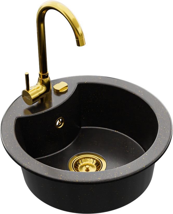 Technická data: dřez: Rozměry: 488 x 488 x 167 mm Hloubka komory: 157 mm Šířka komory: 406 mm Průměr odtoku: ø90 mm Typ: 1-komorový Typ: Zapuštěné do pracovní desky Barva: černá/zlatá metalíza Povrchová úprava sifonu: zlatá Materiál: žula (80 % žulové kamenivo, 20 % pryskyřice) Přepadový otvor: Ano Otvory: (baterie, automatické) 2 Vysoká odolnost proti poškrábání a změně barvy Odolnost proti tepelným šokům Snadno čistitelný povrch Jeden dodatečný vyfrézovaný otvor pro samoděrování ø35 kuchyňská baterie: Materiál: mosaz Barva: Zlatá Hlava: Keramická Provzdušňovač: Ano Výška baterie: 335 mm Rozsah výtoku: 180 mm