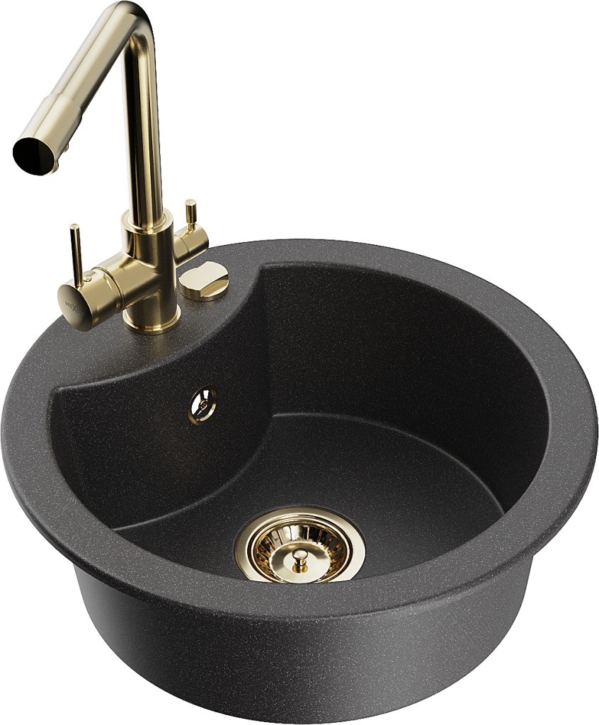 Technická data: dřez: Rozměry: 488 x 488 x 167 mm Hloubka komory: 157 mm Šířka komory: 406 mm Průměr odtoku: ø90 mm Typ: 1-komorový Typ: Zapuštěné do pracovní desky Barva: Skvrnitá černá Povrchová úprava sifonu: zlatá Materiál: žula (80 % žulové kamenivo, 20 % pryskyřice) Přepadový otvor: Ano Otvory: (baterie, automatické) 2 Vysoká odolnost proti poškrábání a změně barvy Odolnost proti tepelným šokům Snadno čistitelný povrch Jeden dodatečný vyfrézovaný otvor pro samoděrování ø35 kuchyňská baterie: Materiál: mosaz Barva: Zlatá Hlava: Keramická Provzdušňovač: Ano Typ: Dvě rukojeti Rozsah výtoku: 235 mm Výška baterie: 315 mm Dvouhlavá baterie s přídavným kanálem pro filtrovanou pitnou vodu
