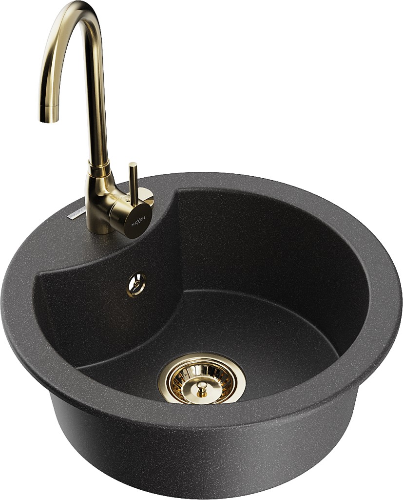 Technická data: dřez: Rozměry: 488 x 488 x 167 mm Hloubka komory: 157 mm Šířka komory: 406 mm Průměr odtoku: ø90 mm Typ: 1-komorový Typ: Zapuštěné do pracovní desky Barva: Skvrnitá černá Povrchová úprava sifonu: zlatá Materiál: žula (80 % žulové kamenivo, 20 % pryskyřice) Přepadový otvor: Ano Otvory: (baterie, automatické) 2 Vysoká odolnost proti poškrábání a změně barvy Odolnost proti tepelným šokům Snadno čistitelný povrch Jeden dodatečný vyfrézovaný otvor pro samoděrování ø35 kuchyňská baterie: Materiál: mosaz Barva: Zlatá Hlava: Keramická Provzdušňovač: Ano Typ: Jedna páka Výška baterie: 335 mm Rozsah výtoku: 180 mm