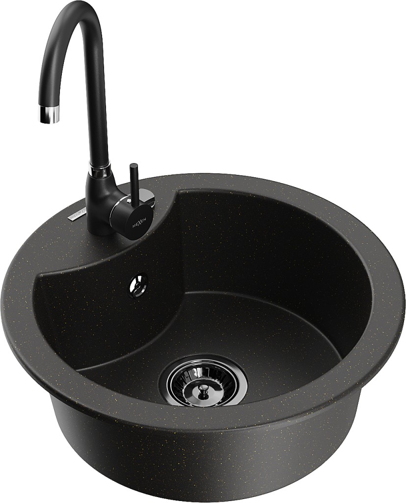 Technická data: dřez: Rozměry: 488 x 488 x 167 mm Hloubka komory: 157 mm Šířka komory: 406 mm Průměr odtoku: ø90 mm Typ: 1-komorový Typ: Zapuštěné do pracovní desky Barva: černá/zlatá metalíza Povrchová úprava sifonu: černá Materiál: žula (80 % žulové kamenivo, 20 % pryskyřice) Přepadový otvor: Ano Otvory: (baterie, automatické) 2 Vysoká odolnost proti poškrábání a změně barvy Odolnost proti tepelným šokům Snadno čistitelný povrch Jeden dodatečný vyfrézovaný otvor pro samoděrování ø35 kuchyňská baterie: Materiál: mosaz Černá barva Hlava: Keramická Provzdušňovač: Ano Typ: Jedna páka Výška baterie: 335 mm Rozsah výtoku: 180 mm