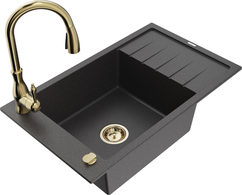 Technická data: dřez: Rozměr: 795 x 480 x 200 mm Hloubka komory: 190 mm Rozměry komory: 465x420 mm Průměr odtoku: ø90 mm Typ: 1-miska s krátkým odkapávačem Typ: Zapuštěné do pracovní desky Barva: Skvrnitá černá Povrchová úprava sifonu: zlatá Materiál: žula (80 % žulové kamenivo, 20 % pryskyřice) Přepadový otvor: Ano Otvory: (baterie, automatické) 2 Instalace: Univerzální, lze instalovat s odkapávačem na levou nebo pravou stranu Vysoká odolnost proti poškrábání a změně barvy Odolnost proti tepelným šokům Snadno čistitelný povrch Jeden dodatečný vyfrézovaný otvor pro samoděrování ø35 kuchyňská baterie: Materiál: mosaz Barva: Zlatá Hlava: Keramická Provzdušňovač: Ano Typ: Jedna páka Výška baterie: 410 mm Rozsah výtoku: 231 mm