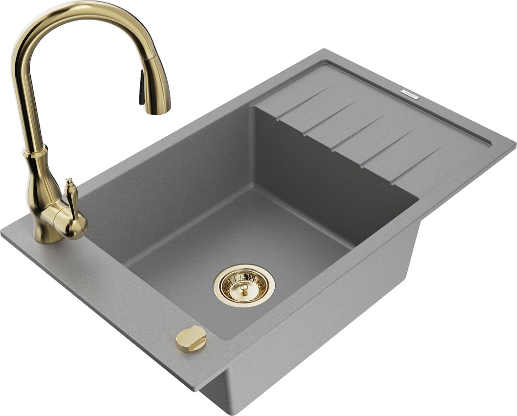 Technická data: dřez: Rozměr: 795 x 480 x 200 mm Hloubka komory: 190 mm Rozměry komory: 465x420 mm Průměr odtoku: ø90 mm Typ: 1-miska s krátkým odkapávačem Typ: Zapuštěné do pracovní desky Šedá barva Povrchová úprava sifonu: zlatá Materiál: žula (80 % žulové kamenivo, 20 % pryskyřice) Přepadový otvor: Ano Otvory: (baterie, automatické) 2 Instalace: Univerzální, lze instalovat s odkapávačem na levou nebo pravou stranu Vysoká odolnost proti poškrábání a změně barvy Odolnost proti tepelným šokům Snadno čistitelný povrch Jeden dodatečný vyfrézovaný otvor pro samoděrování ø35 kuchyňská baterie: Materiál: mosaz Barva: Zlatá Hlava: Keramická Provzdušňovač: Ano Typ: Jedna páka Výška baterie: 410 mm Rozsah výtoku: 231 mm