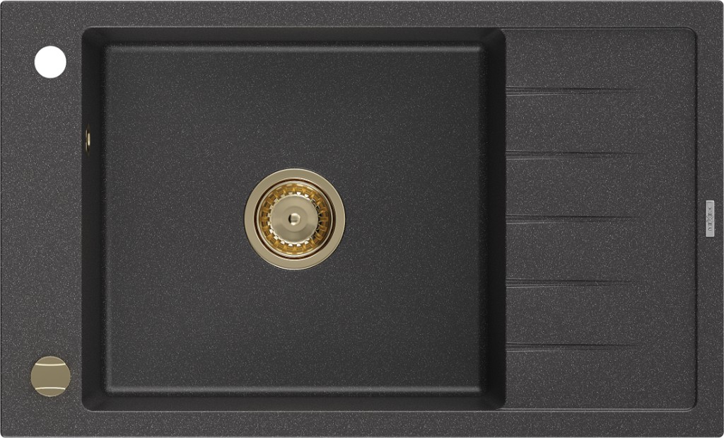 Technická data: Rozměr: 795 x 480 x 200 mm Hloubka komory: 190 mm Rozměry komory: 465x420 mm Průměr odtoku: ø90 mm Typ: 1-miska s krátkým odkapávačem Typ: Zapuštěné do pracovní desky Materiál: žula Barva: Skvrnitá černá Povrchová úprava sifonu: zlatá Přepadový otvor: Ano Otvor pro baterii: Ano Včetně automatického sifonu Vysoká odolnost proti poškrábání a změně barvy Odolnost proti tepelným šokům Snadno čistitelný povrch Jeden dodatečný vyfrézovaný otvor pro samoděrování ø35
