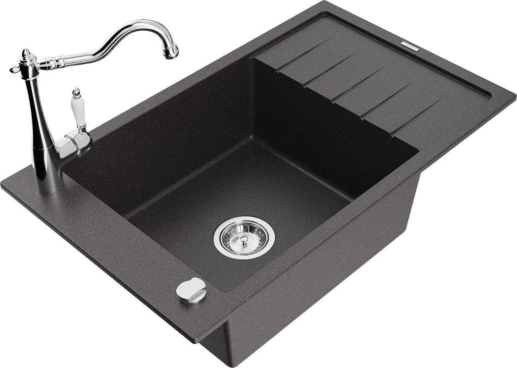 Technická data: dřez: Rozměr: 795 x 480 x 200 mm Hloubka komory: 190 mm Rozměry komory: 465x420 mm Průměr odtoku: ø90 mm Typ: 1-miska s krátkým odkapávačem Typ: Zapuštěné do pracovní desky Barva: Skvrnitá černá Povrchová úprava sifonu: Chrome Materiál: žula (80 % žulové kamenivo, 20 % pryskyřice) Přepadový otvor: Ano Otvory: (baterie, automatické) 2 Instalace: Univerzální, lze instalovat s odkapávačem na levou nebo pravou stranu Vysoká odolnost proti poškrábání a změně barvy Odolnost proti tepelným šokům Snadno čistitelný povrch Jeden dodatečný vyfrézovaný otvor pro samoděrování ø35 kuchyňská baterie: Materiál: mosaz Barva: Chrome Hlava: Keramická Provzdušňovač: Ano Typ: Jedna páka Výška baterie: 290 mm Rozsah výtoku: 260 mm