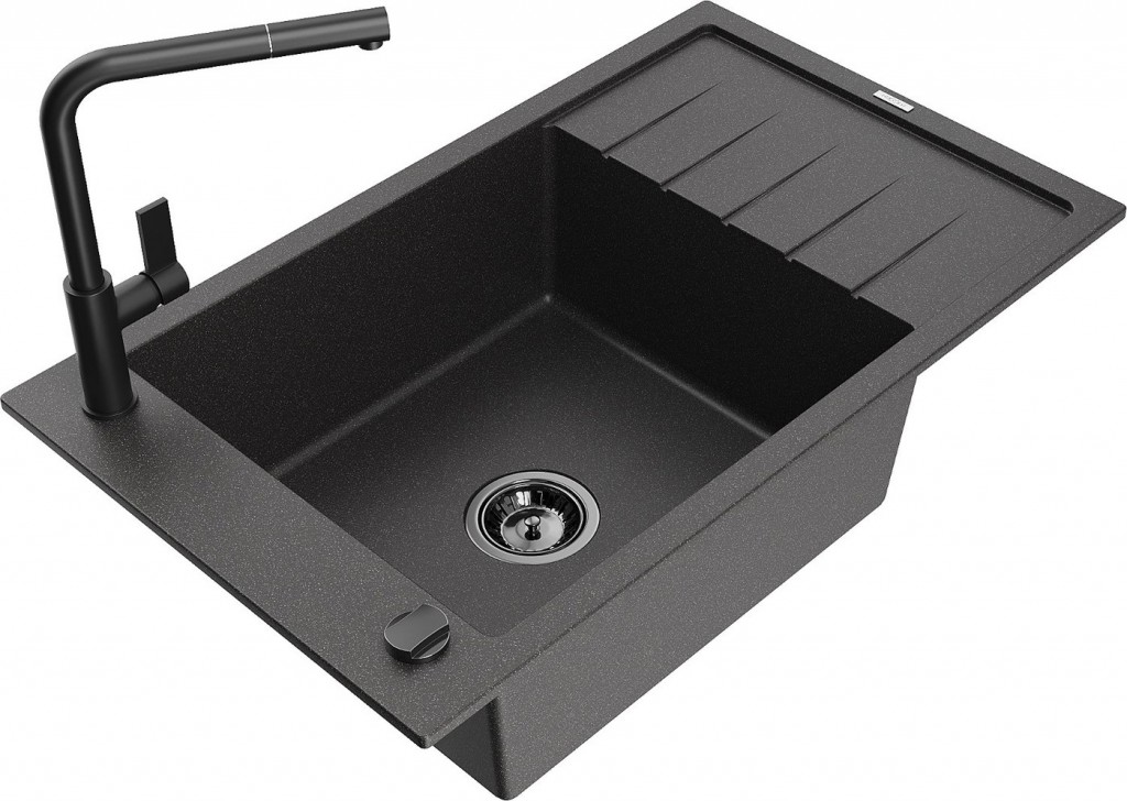 Technické údaje: Kuchyňský dřez: Rozměr: 795x480x200 mm Hloubka komory: 190 mm Rozměry komory: 465x420 mm Průměr odtoku: ø90 mm Typ: 1-miska s krátkým odkapávačem Typ: Zapuštěné do pracovní desky Barva: Skvrnitá černá Povrchová úprava sifonu: černá Materiál: žula (80% žulové kamenivo 20% pryskyřice) Přepadový otvor: Ano Otvory: (baterie, automat) 2 Instalace: Univerzální, lze instalovat s odkapávačem na levou nebo pravou stranu Vysoká odolnost proti poškrábání a změně barvy Odolnost proti tepelným šokům Povrch pro snadné čištění Jeden dodatečný vyfrézovaný otvor pro samoděrování ø35 Kuchyňská baterie: Materiál: mosaz Barva: Černá Hlava: Keramická Perlátor: Ano Typ: Jednopákový Rozsah výtoku: 245 mm Výška baterie: 307 mm