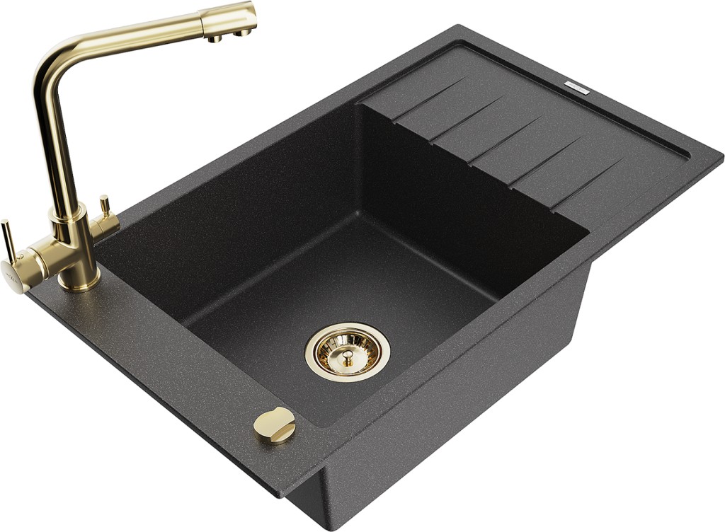 Technická data: dřez: Rozměr: 795 x 480 x 200 mm Hloubka komory: 190 mm Rozměry komory: 465x420 mm Průměr odtoku: ø90 mm Typ: 1-miska s krátkým odkapávačem Typ: Zapuštěné do pracovní desky Barva: Skvrnitá černá Povrchová úprava sifonu: zlatá Materiál: žula (80 % žulové kamenivo, 20 % pryskyřice) Přepadový otvor: Ano Otvory: (baterie, automatické) 2 Instalace: Univerzální, lze instalovat s odkapávačem na levou nebo pravou stranu Vysoká odolnost proti poškrábání a změně barvy Odolnost proti tepelným šokům Snadno čistitelný povrch Jeden dodatečný vyfrézovaný otvor pro samoděrování ø35 kuchyňská baterie: Materiál: mosaz Barva: Zlatá Hlava: Keramická Provzdušňovač: Ano Typ: Dvě rukojeti Rozsah výtoku: 235 mm Výška baterie: 315 mm Dvouhlavá baterie s přídavným kanálem pro filtrovanou pitnou vodu