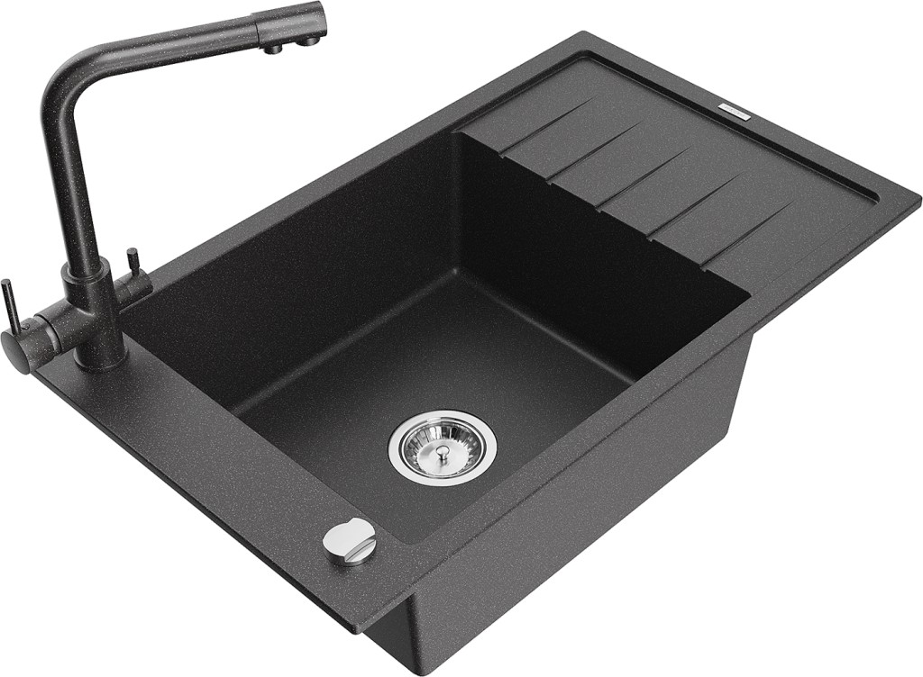 Technická data: dřez: Rozměr: 795 x 480 x 200 mm Hloubka komory: 190 mm Rozměry komory: 465x420 mm Průměr odtoku: ø90 mm Typ: 1-miska s krátkým odkapávačem Typ: Zapuštěné do pracovní desky Barva: Skvrnitá černá Povrchová úprava sifonu: Chrome Materiál: žula (80 % žulové kamenivo, 20 % pryskyřice) Přepadový otvor: Ano Otvory: (baterie, automatické) 2 Instalace: Univerzální, lze instalovat s odkapávačem na levou nebo pravou stranu Vysoká odolnost proti poškrábání a změně barvy Odolnost proti tepelným šokům Snadno čistitelný povrch Jeden dodatečný vyfrézovaný otvor pro samoděrování ø35 kuchyňská baterie: Materiál: mosaz Barva: Skvrnitá černá Hlava: Keramická Provzdušňovač: Ano Typ: Dvě rukojeti Rozsah výtoku: 235 mm Výška baterie: 315 mm Dvouhlavá baterie s přídavným kanálem pro filtrovanou pitnou vodu