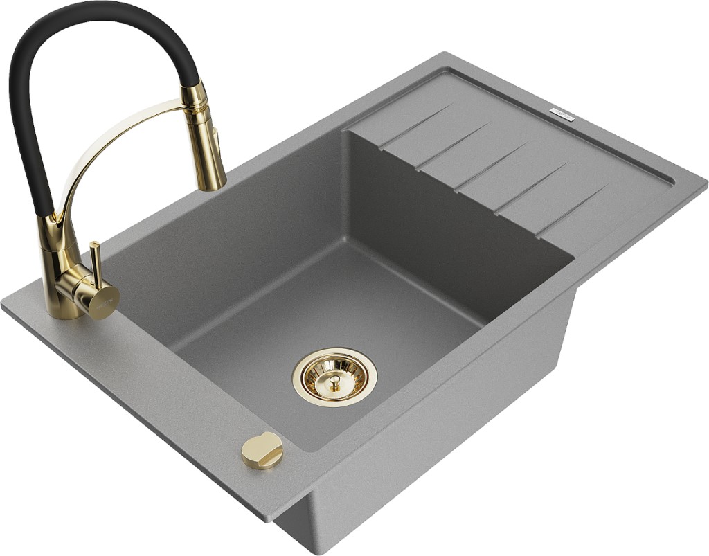 Technická data: dřez: Rozměr: 795 x 480 x 200 mm Hloubka komory: 190 mm Rozměry komory: 465x420 mm Průměr odtoku: ø90 mm Typ: 1-miska s krátkým odkapávačem Typ: Zapuštěné do pracovní desky Šedá barva Povrchová úprava sifonu: zlatá Materiál: žula (80 % žulové kamenivo, 20 % pryskyřice) Přepadový otvor: Ano Otvory: (baterie, automatické) 2 Instalace: Univerzální, lze instalovat s odkapávačem na levou nebo pravou stranu Vysoká odolnost proti poškrábání a změně barvy Odolnost proti tepelným šokům Snadno čistitelný povrch Jeden dodatečný vyfrézovaný otvor pro samoděrování ø35 kuchyňská baterie: Materiál: mosaz Barva Zlatá/Černá Hlava: Keramická Provzdušňovač: Ano Typ: Jedna páka Výška baterie: 430 mm Rozsah výtoku: 185 mm Baterie má výsuvný výtok