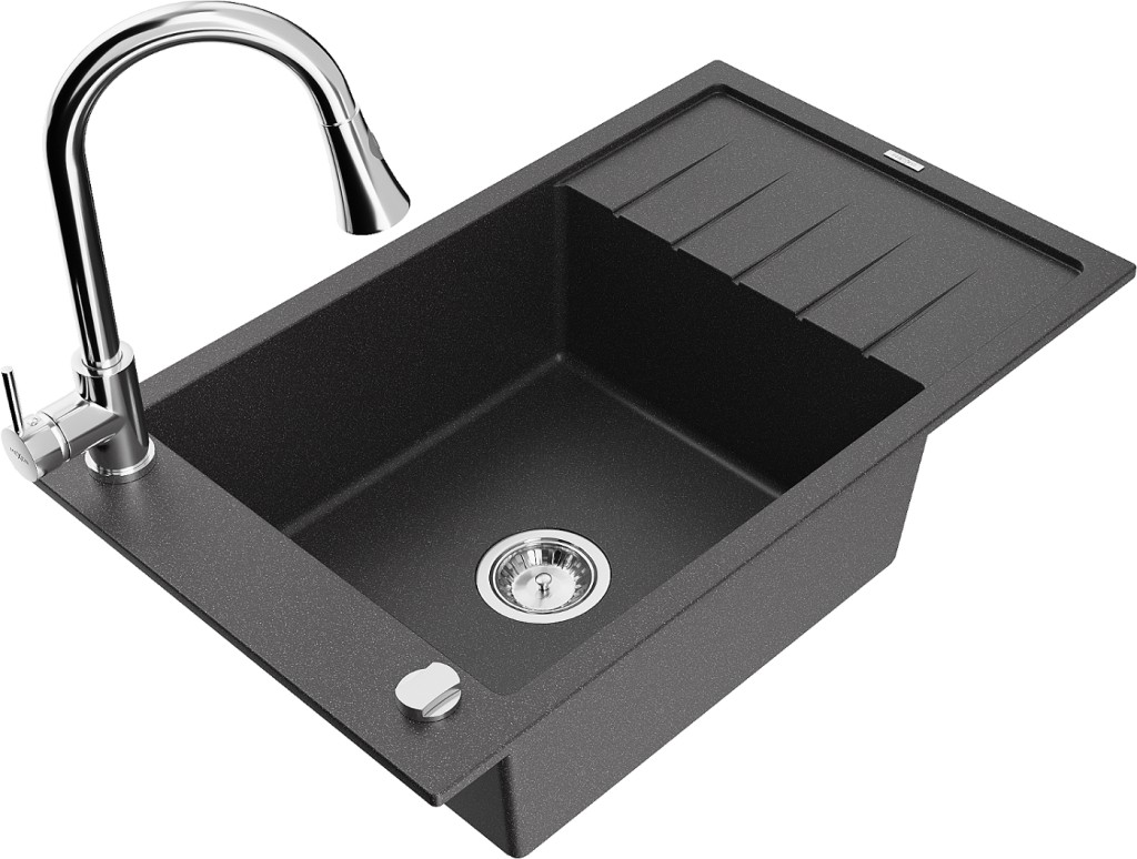 Technická data: dřez: Rozměr: 795 x 480 x 200 mm Hloubka komory: 190 mm Rozměry komory: 465x420 mm Průměr odtoku: ø90 mm Typ: 1-miska s krátkým odkapávačem Typ: Zapuštěné do pracovní desky Barva: Skvrnitá černá Povrchová úprava sifonu: Chrome Materiál: žula (80 % žulové kamenivo, 20 % pryskyřice) Přepadový otvor: Ano Otvory: (baterie, automatické) 2 Instalace: Univerzální, lze instalovat s odkapávačem na levou nebo pravou stranu Vysoká odolnost proti poškrábání a změně barvy Odolnost proti tepelným šokům Snadno čistitelný povrch Jeden dodatečný vyfrézovaný otvor pro samoděrování ø35 kuchyňská baterie: Materiál: mosaz Barva: Chrome Hlava: Keramická Provzdušňovač: Ano Typ: Jedna páka Výška baterie: 380 mm Rozsah výtoku: 252 mm Typ výtoku: Výsuvný