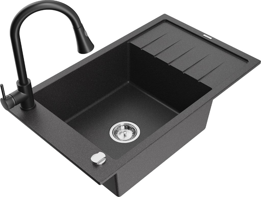 Technická data: dřez: Rozměr: 795 x 480 x 200 mm Hloubka komory: 190 mm Rozměry komory: 465x420 mm Průměr odtoku: ø90 mm Typ: 1-miska s krátkým odkapávačem Typ: Zapuštěné do pracovní desky Barva: Skvrnitá černá Povrchová úprava sifonu: Chrome Materiál: žula (80 % žulové kamenivo, 20 % pryskyřice) Přepadový otvor: Ano Otvory: (baterie, automatické) 2 Instalace: Univerzální, lze instalovat s odkapávačem na levou nebo pravou stranu Vysoká odolnost proti poškrábání a změně barvy Odolnost proti tepelným šokům Snadno čistitelný povrch Jeden dodatečný vyfrézovaný otvor pro samoděrování ø35 kuchyňská baterie: Materiál: mosaz Černá barva Hlava: Keramická Provzdušňovač: Ano Typ: Jedna páka Výška baterie: 380 mm Rozsah výtoku: 252 mm Typ výtoku: Výsuvný