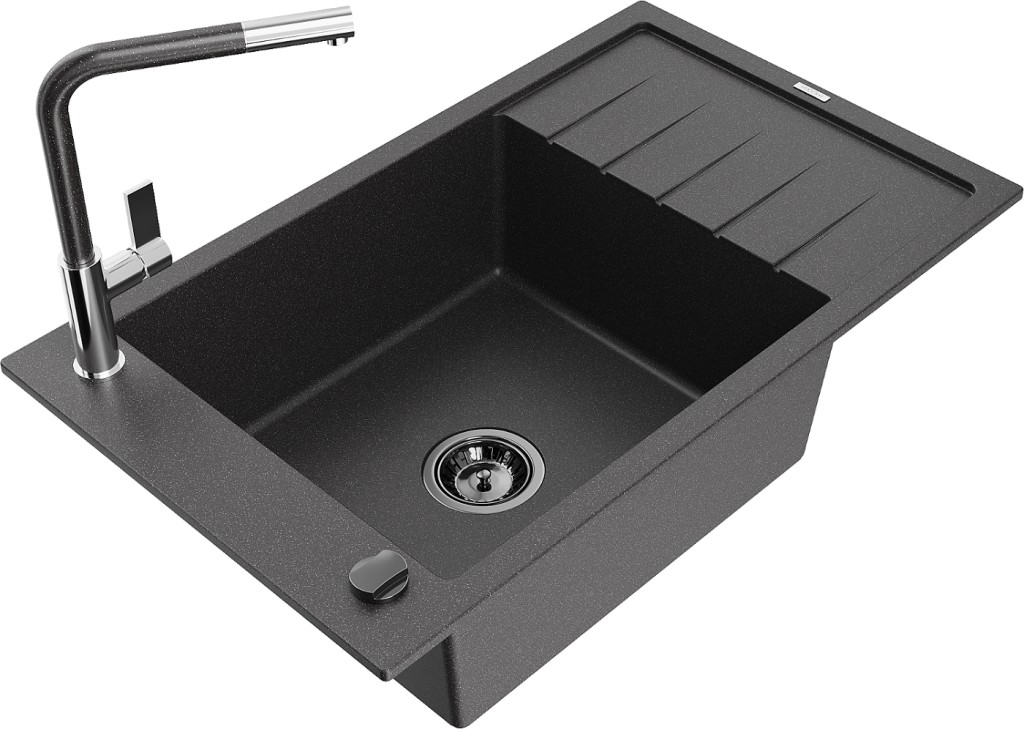 Technická data: dřez: Rozměr: 795 x 480 x 200 mm Hloubka komory: 190 mm Rozměry komory: 465x420 mm Průměr odtoku: ø90 mm Typ: 1-miska s krátkým odkapávačem Typ: Zapuštěné do pracovní desky Barva: Skvrnitá černá Povrchová úprava sifonu: černá Materiál: žula (80 % žulové kamenivo, 20 % pryskyřice) Přepadový otvor: Ano Otvory: (baterie, automatické) 2 Instalace: Univerzální, lze instalovat s odkapávačem na levou nebo pravou stranu Vysoká odolnost proti poškrábání a změně barvy Odolnost proti tepelným šokům Snadno čistitelný povrch Jeden dodatečný vyfrézovaný otvor pro samoděrování ø35 kuchyňská baterie: Materiál: mosaz Barva: chrom/černá skvrnitá Hlava: Keramická Provzdušňovač: Ano Typ: Jedna páka Rozsah výtoku: 245 mm Výška baterie: 307 mm