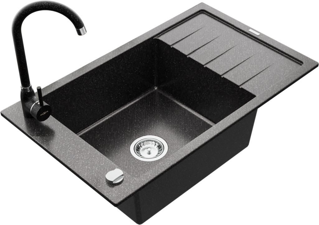 Technická data: dřez: Rozměr: 795 x 480 x 200 mm Hloubka komory: 190 mm Rozměry komory: 465x420 mm Průměr odtoku: ø90 mm Typ: 1-miska s krátkým odkapávačem Typ: Zapuštěné do pracovní desky Barva: Skvrnitá černá Povrchová úprava sifonu: Chrome Materiál: žula (80 % žulové kamenivo, 20 % pryskyřice) Přepadový otvor: Ano Otvory: (baterie, automatické) 2 Instalace: Univerzální, lze instalovat s odkapávačem na levou nebo pravou stranu Vysoká odolnost proti poškrábání a změně barvy Odolnost proti tepelným šokům Snadno čistitelný povrch Jeden dodatečný vyfrézovaný otvor pro samoděrování ø35 kuchyňská baterie: Materiál: mosaz Barva: Skvrnitá černá Hlava: Keramická Provzdušňovač: Ano Výška baterie: 335 mm Rozsah výtoku: 180 mm