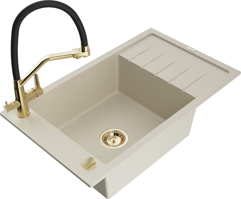 Technická data: Dřez: Rozměr: 795x480x200 mm Hloubka komory: 190 mm Rozměry komory: 465x420 mm Průměr odtoku: ø90 mm Typ: 1-miska s krátkým odkapávačem Typ: Zapuštěné do pracovní desky Barva béžová Povrchová úprava sifonu: zlatá Materiál: žula (80% žulové kamenivo 20% pryskyřice) Přepadový otvor: Ano Otvory: (baterie, automat) 2 Instalace: Univerzální, lze instalovat s odkapávačem na levou nebo pravou stranu Vysoká odolnost proti poškrábání a změně barvy Odolnost proti tepelným šokům Povrch pro snadné čištění Jeden dodatečný vyfrézovaný otvor pro samoděrování ø35 Kuchyňská baterie: Materiál: mosaz Barva: Zlatá/Černá Hlavy: Keramické Perlátor: Ano Typ výtoku: Flexibilní s mosaznou podpěrou Rozsah výtoku: 260 mm Výška: 405 mm Typ: Dvě rukojeti Dvouhlavá baterie s přídavným filtrem na pitnou vodu