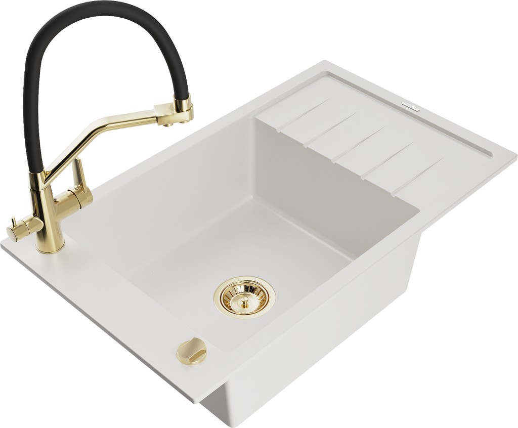 Technická data: dřez: Rozměr: 795 x 480 x 200 mm Hloubka komory: 190 mm Rozměry komory: 465x420 mm Průměr odtoku: ø90 mm Typ: 1-miska s krátkým odkapávačem Typ: Zapuštěné do pracovní desky bílá barva Povrchová úprava sifonu: zlatá Materiál: žula (80 % žulové kamenivo, 20 % pryskyřice) Přepadový otvor: Ano Otvory: (baterie, automatické) 2 Instalace: Univerzální, lze instalovat s odkapávačem na levou nebo pravou stranu Vysoká odolnost proti poškrábání a změně barvy Odolnost proti tepelným šokům Snadno čistitelný povrch Jeden dodatečný vyfrézovaný otvor pro samoděrování ø35 kuchyňská baterie: Materiál: mosaz Barva: Zlatá/Černá Hlavy: Keramické Provzdušňovač: Ano Typ hubice: Flexibilní s mosazným držákem Rozsah výtoku: 260 mm Výška: 405 mm Typ: Dvě rukojeti Dvouhlavá baterie s přídavným filtrem na pitnou vodu