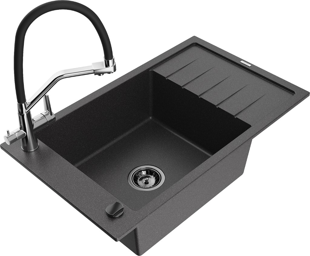 Technická data: dřez: Rozměr: 795 x 480 x 200 mm Hloubka komory: 190 mm Rozměry komory: 465x420 mm Průměr odtoku: ø90 mm Typ: 1-miska s krátkým odkapávačem Typ: Zapuštěné do pracovní desky Barva: Skvrnitá černá Povrchová úprava sifonu: černá Materiál: žula (80 % žulové kamenivo, 20 % pryskyřice) Přepadový otvor: Ano Otvory: (baterie, automatické) 2 Instalace: Univerzální, lze instalovat s odkapávačem na levou nebo pravou stranu Vysoká odolnost proti poškrábání a změně barvy Odolnost proti tepelným šokům Snadno čistitelný povrch Jeden dodatečný vyfrézovaný otvor pro samoděrování ø35 kuchyňská baterie: Materiál: mosaz Barva: chrom/černá Hlavy: Keramické Provzdušňovač: Ano Typ hubice: Flexibilní s mosazným držákem Rozsah výtoku: 260 mm Výška: 405 mm Typ: Dvě rukojeti Dvouhlavá baterie s přídavným filtrem na pitnou vodu