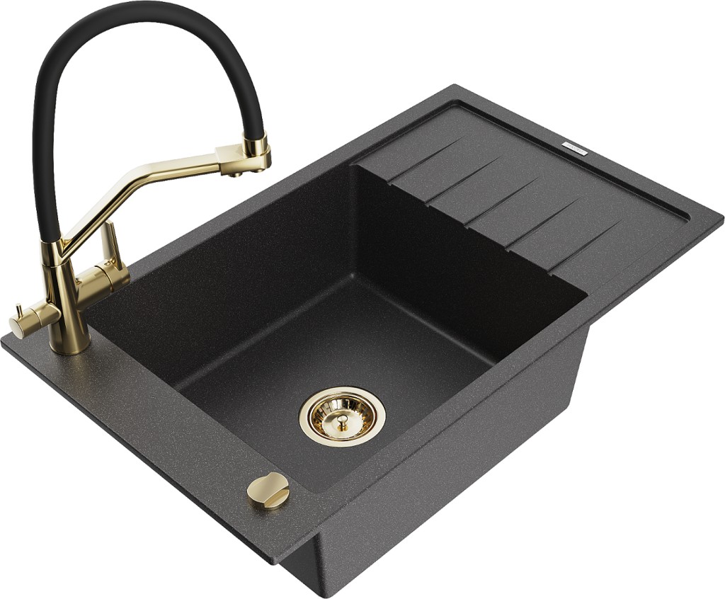 Technická data: dřez: Rozměr: 795 x 480 x 200 mm Hloubka komory: 190 mm Rozměry komory: 465x420 mm Průměr odtoku: ø90 mm Typ: 1-miska s krátkým odkapávačem Typ: Zapuštěné do pracovní desky Barva: Skvrnitá černá Povrchová úprava sifonu: zlatá Materiál: žula (80 % žulové kamenivo, 20 % pryskyřice) Přepadový otvor: Ano Otvory: (baterie, automatické) 2 Instalace: Univerzální, lze instalovat s odkapávačem na levou nebo pravou stranu Vysoká odolnost proti poškrábání a změně barvy Odolnost proti tepelným šokům Snadno čistitelný povrch Jeden dodatečný vyfrézovaný otvor pro samoděrování ø35 kuchyňská baterie: Materiál: mosaz Barva: Zlatá/Černá Hlavy: Keramické Provzdušňovač: Ano Typ hubice: Flexibilní s mosazným držákem Rozsah výtoku: 260 mm Výška: 405 mm Typ: Dvě rukojeti Dvouhlavá baterie s přídavným filtrem na pitnou vodu