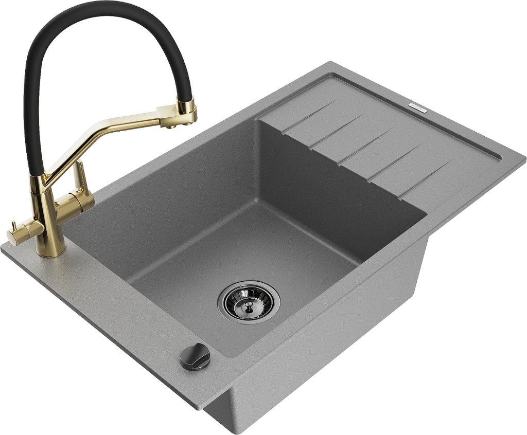 Technická data: dřez: Rozměr: 795 x 480 x 200 mm Hloubka komory: 190 mm Rozměry komory: 465x420 mm Průměr odtoku: ø90 mm Typ: 1-miska s krátkým odkapávačem Typ: Zapuštěné do pracovní desky Šedá barva Povrchová úprava sifonu: černá Materiál: žula (80 % žulové kamenivo, 20 % pryskyřice) Přepadový otvor: Ano Otvory: (baterie, automatické) 2 Instalace: Univerzální, lze instalovat s odkapávačem na levou nebo pravou stranu Vysoká odolnost proti poškrábání a změně barvy Odolnost proti tepelným šokům Snadno čistitelný povrch Jeden dodatečný vyfrézovaný otvor pro samoděrování ø35 kuchyňská baterie: Materiál: mosaz Barva: Zlatá/Černá Hlavy: Keramické Provzdušňovač: Ano Typ hubice: Flexibilní s mosazným držákem Rozsah výtoku: 260 mm Výška: 405 mm Typ: Dvě rukojeti Dvouhlavá baterie s přídavným filtrem na pitnou vodu