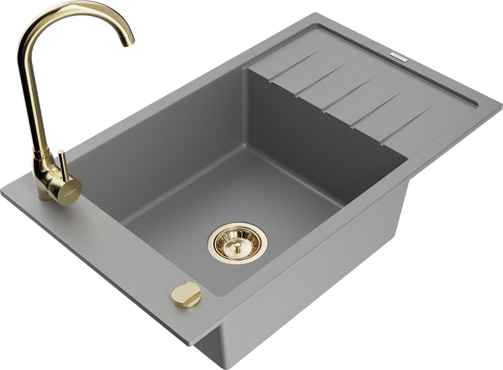 Technická data: dřez: Rozměr: 795 x 480 x 200 mm Hloubka komory: 190 mm Rozměry komory: 465x420 mm Průměr odtoku: ø90 mm Typ: 1-miska s krátkým odkapávačem Typ: Zapuštěné do pracovní desky Šedá barva Povrchová úprava sifonu: zlatá Materiál: žula (80 % žulové kamenivo, 20 % pryskyřice) Přepadový otvor: Ano Otvory: (baterie, automatické) 2 Instalace: Univerzální, lze instalovat s odkapávačem na levou nebo pravou stranu Vysoká odolnost proti poškrábání a změně barvy Odolnost proti tepelným šokům Snadno čistitelný povrch Jeden dodatečný vyfrézovaný otvor pro samoděrování ø35 kuchyňská baterie: Materiál: mosaz Barva: Zlatá Hlava: Keramická Provzdušňovač: Ano Typ: Jedna páka Výška baterie: 335 mm Rozsah výtoku: 180 mm
