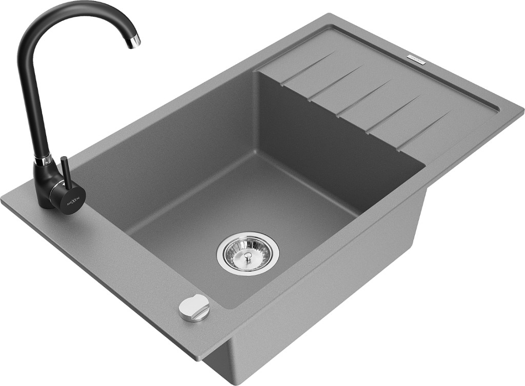 Technická data: dřez: Rozměr: 795 x 480 x 200 mm Hloubka komory: 190 mm Rozměry komory: 465x420 mm Průměr odtoku: ø90 mm Typ: 1-miska s krátkým odkapávačem Typ: Zapuštěné do pracovní desky Šedá barva Povrchová úprava sifonu: Chrome Materiál: žula (80 % žulové kamenivo, 20 % pryskyřice) Přepadový otvor: Ano Otvory: (baterie, automatické) 2 Instalace: Univerzální, lze instalovat s odkapávačem na levou nebo pravou stranu Vysoká odolnost proti poškrábání a změně barvy Odolnost proti tepelným šokům Snadno čistitelný povrch Jeden dodatečný vyfrézovaný otvor pro samoděrování ø35 kuchyňská baterie: Materiál: mosaz Černá barva Hlava: Keramická Provzdušňovač: Ano Typ: Jedna páka Výška baterie: 335 mm Rozsah výtoku: 180 mm