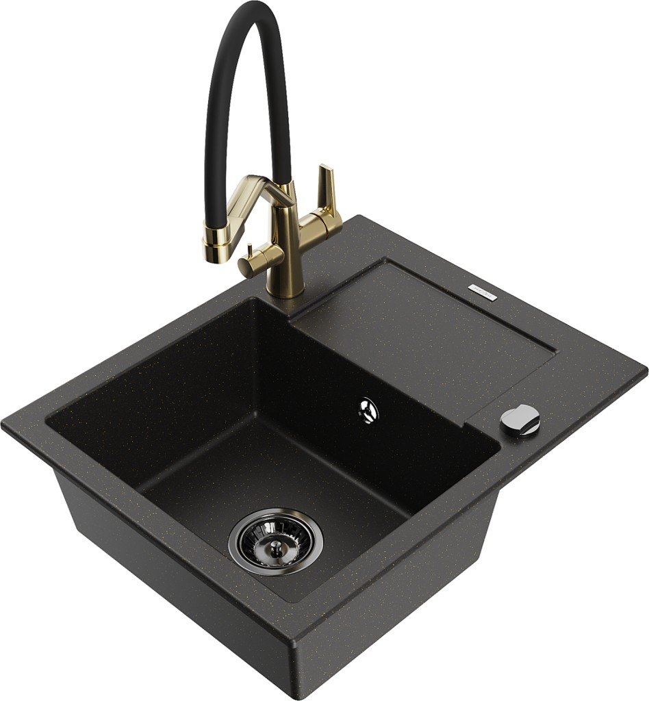 Technická data: dřez: Rozměr: 576x465x174mm Hloubka komory: 164 mm Rozměry komory: 395x320 mm Průměr odtoku: ø90 mm Typ: 1-miska s krátkým odkapávačem Typ: Zapuštěné do pracovní desky Barva: černá/zlatá metalíza Povrchová úprava sifonu: černá Materiál: žula (80 % žulové kamenivo, 20 % pryskyřice) Přepadový otvor: Ano Otvory: (baterie, automatické) 2 Instalace: Univerzální, lze instalovat s odkapávačem na levou nebo pravou stranu Vysoká odolnost proti poškrábání a změně barvy Odolnost proti tepelným šokům Snadno čistitelný povrch Dva dodatečné vyfrézované otvory pro samoděrování ø35 kuchyňská baterie: Materiál: mosaz Barva: Zlatá/Černá Hlavy: Keramické Provzdušňovač: Ano Typ hubice: Flexibilní s mosazným držákem Rozsah výtoku: 260 mm Výška: 405 mm Typ: Dvě rukojeti Dvouhlavá baterie s přídavným filtrem na pitnou vodu