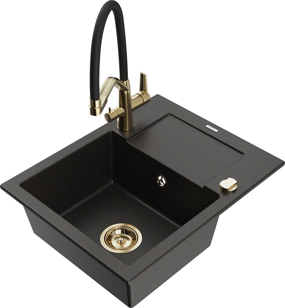 Technická data: dřez: Rozměr: 576x465x174mm Hloubka komory: 164 mm Rozměry komory: 395x320 mm Průměr odtoku: ø90 mm Typ: 1-miska s krátkým odkapávačem Typ: Zapuštěné do pracovní desky Barva: černá/zlatá metalíza Povrchová úprava sifonu: zlatá Materiál: žula (80 % žulové kamenivo, 20 % pryskyřice) Přepadový otvor: Ano Otvory: (baterie, automatické) 2 Instalace: Univerzální, lze instalovat s odkapávačem na levou nebo pravou stranu Vysoká odolnost proti poškrábání a změně barvy Odolnost proti tepelným šokům Snadno čistitelný povrch Dva dodatečné vyfrézované otvory pro samoděrování ø35 kuchyňská baterie: Materiál: mosaz Barva: Zlatá/Černá Hlavy: Keramické Provzdušňovač: Ano Typ hubice: Flexibilní s mosazným držákem Rozsah výtoku: 260 mm Výška: 405 mm Typ: Dvě rukojeti Dvouhlavá baterie s přídavným filtrem na pitnou vodu