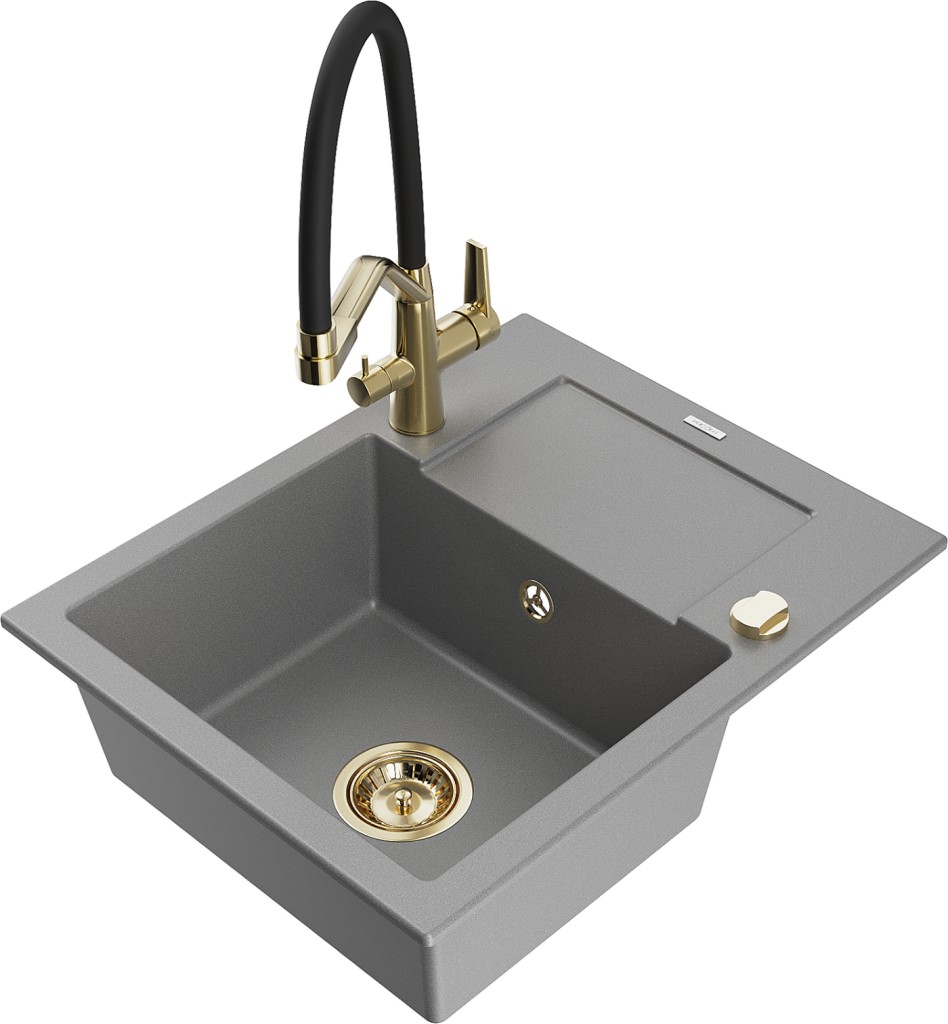 Technická data: dřez: Rozměr: 576x465x174mm Hloubka komory: 164 mm Rozměry komory: 395x320 mm Průměr odtoku: ø90 mm Typ: 1-miska s krátkým odkapávačem Typ: Zapuštěné do pracovní desky Šedá barva Povrchová úprava sifonu: zlatá Materiál: žula (80 % žulové kamenivo, 20 % pryskyřice) Přepadový otvor: Ano Otvory: (baterie, automatické) 2 Instalace: Univerzální, lze instalovat s odkapávačem na levou nebo pravou stranu Vysoká odolnost proti poškrábání a změně barvy Odolnost proti tepelným šokům Snadno čistitelný povrch Dva dodatečné vyfrézované otvory pro samoděrování ø35 kuchyňská baterie: Materiál: mosaz Barva: Zlatá/Černá Hlavy: Keramické Provzdušňovač: Ano Typ hubice: Flexibilní s mosazným držákem Rozsah výtoku: 260 mm Výška: 405 mm Typ: Dvě rukojeti Dvouhlavá baterie s přídavným filtrem na pitnou vodu